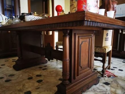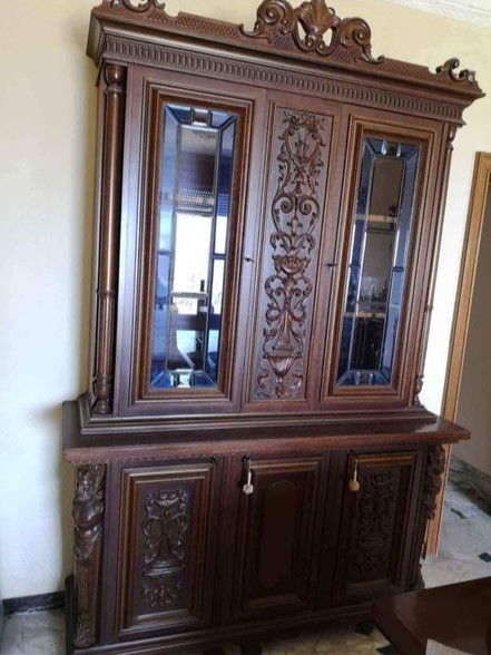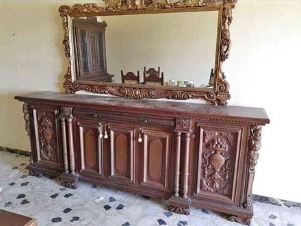 W skład kompletu wchodzi: bufet z lustrem, kredens, stół, 4 x krzesło.
