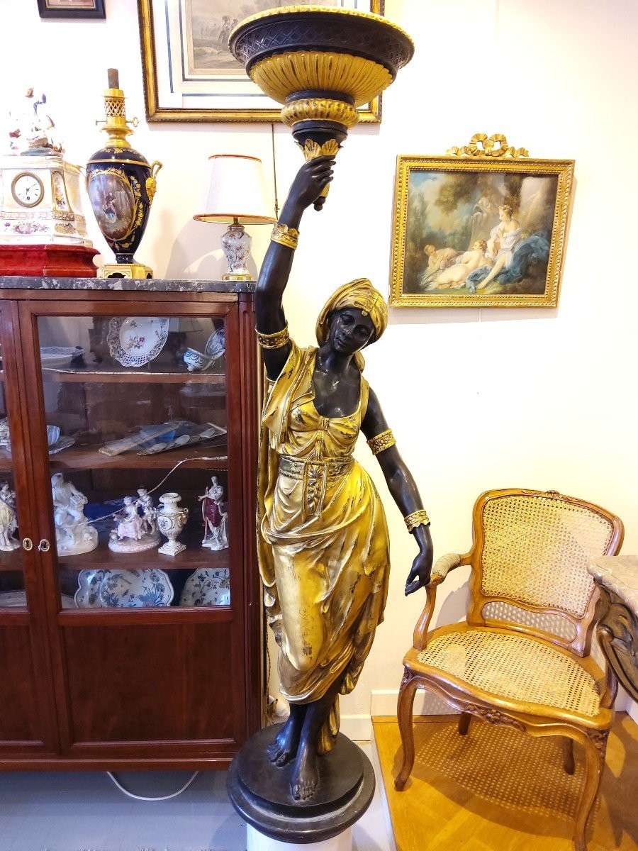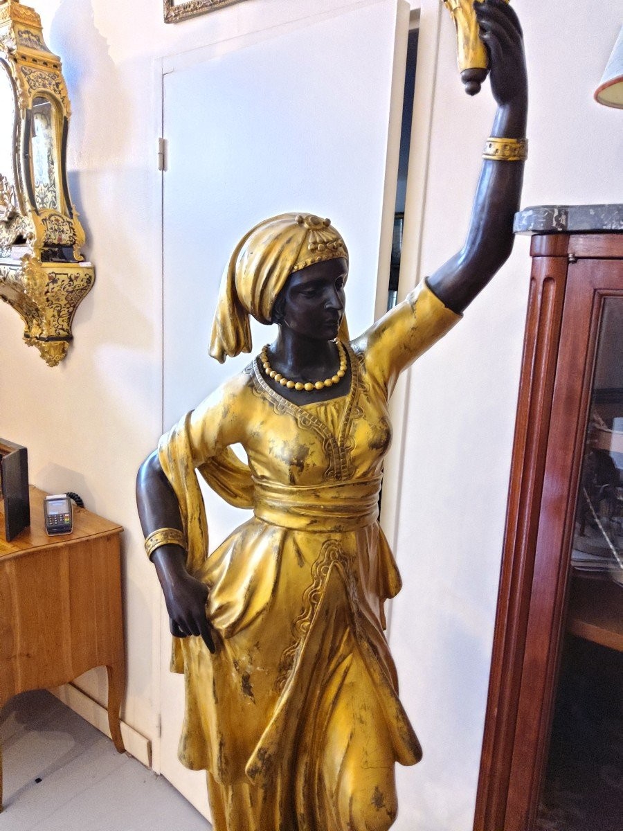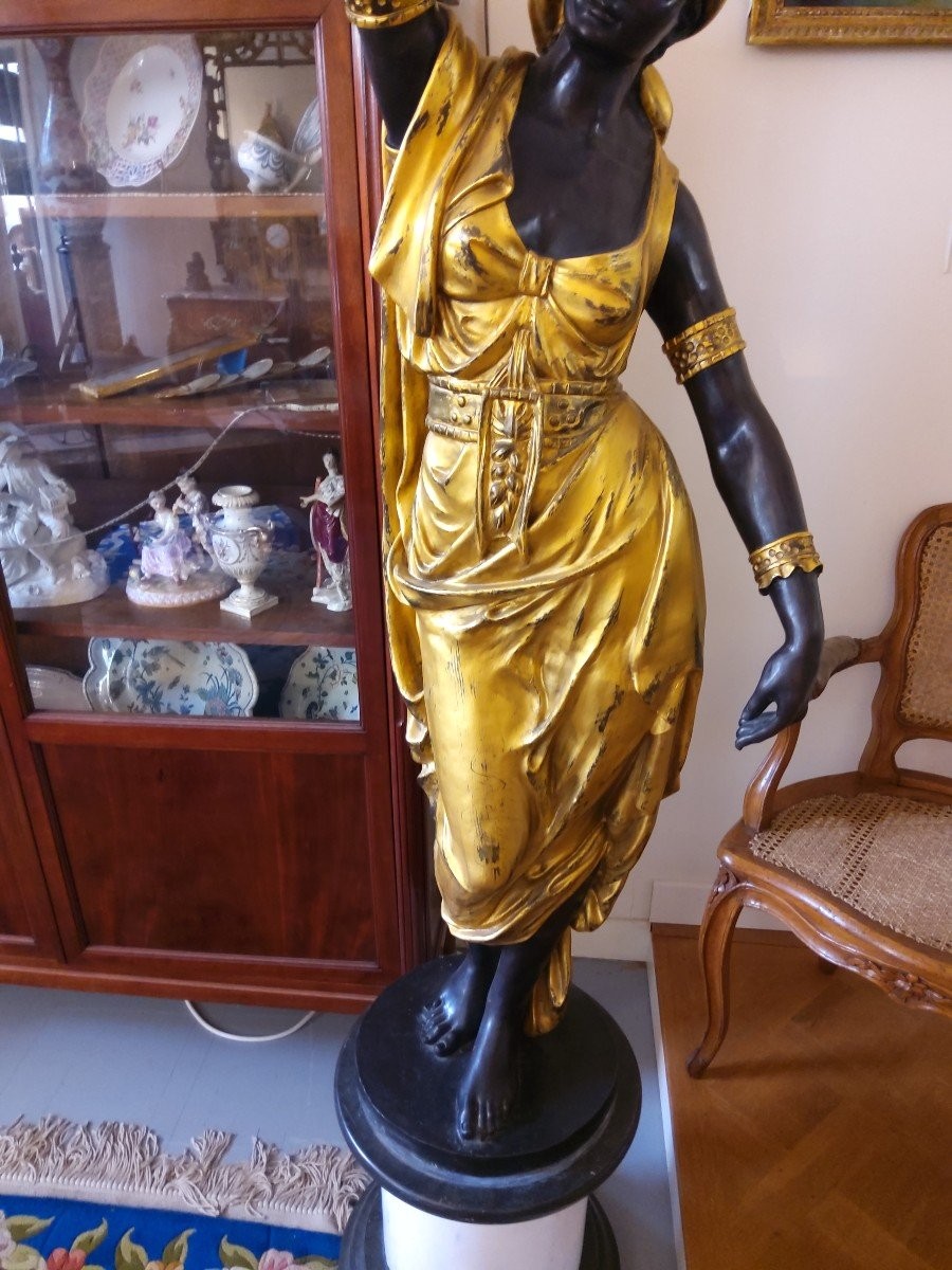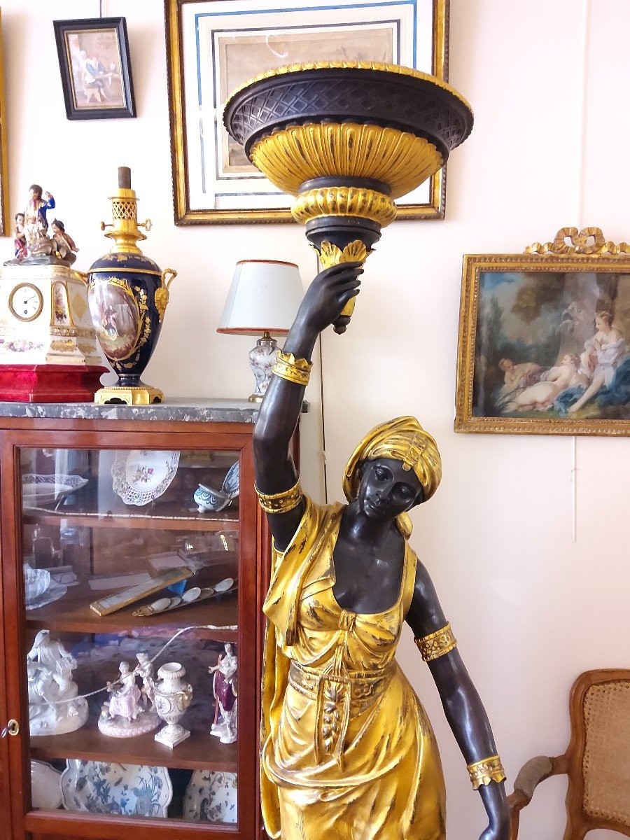 Para kobiet z brązu i marmuru, trzymających uniesione ramię z podstawą lampy. Rzeźby kobiet stoją na marmurowych postumentach. Przedmioty z połowy XX wieku.