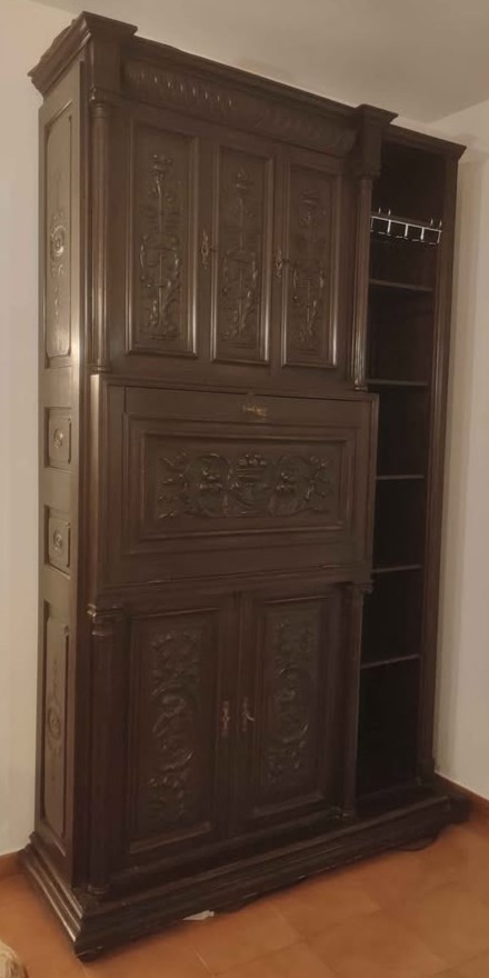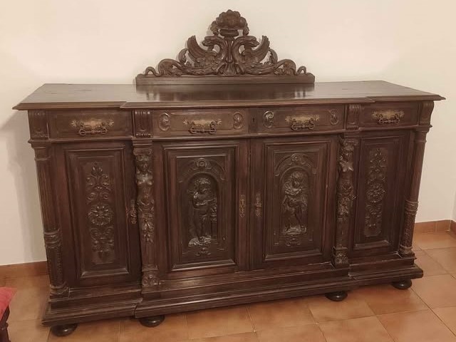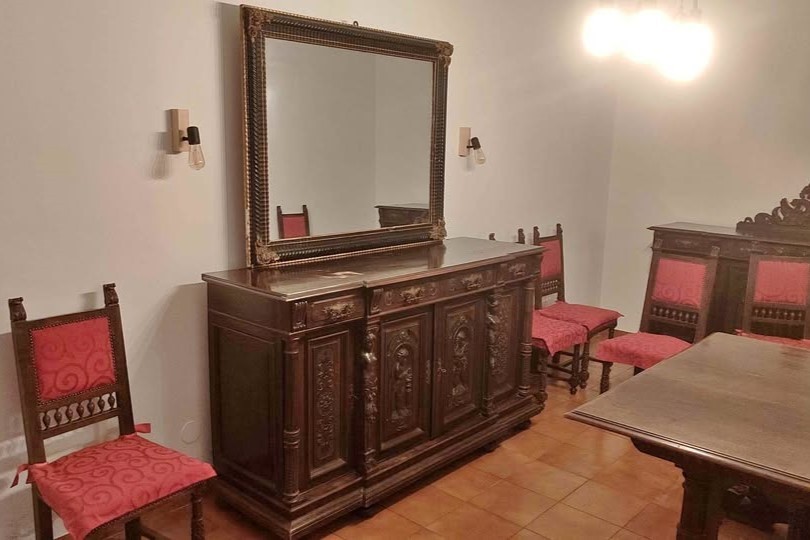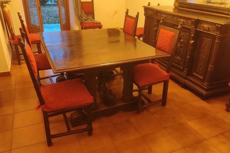 W skład kompletu wchodzi: 2 x bufet, stół, 10 x krzesło, szafa.