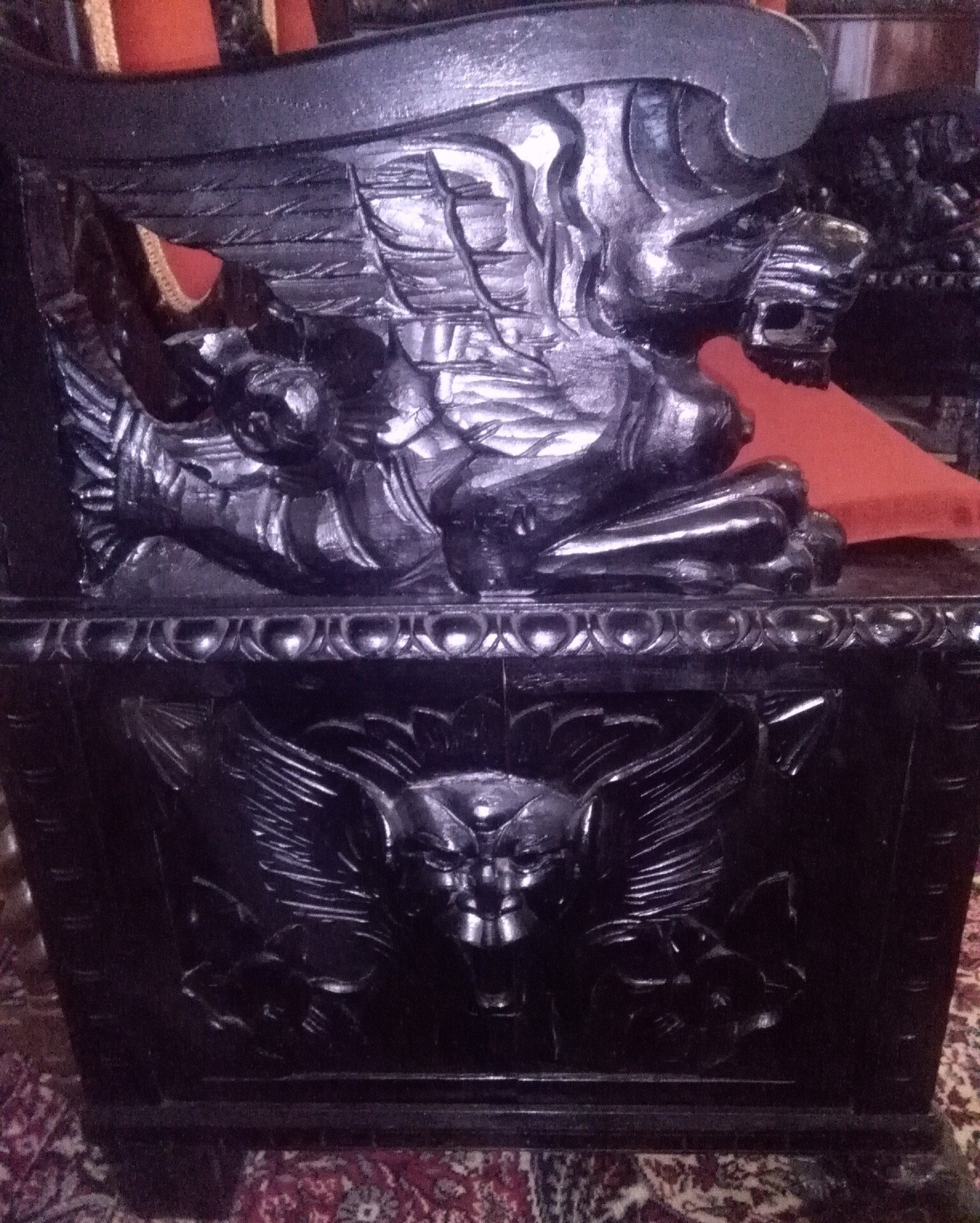 W skład kompletu wchodzi: ławka/skrzynia, 2 x fotel, stół.