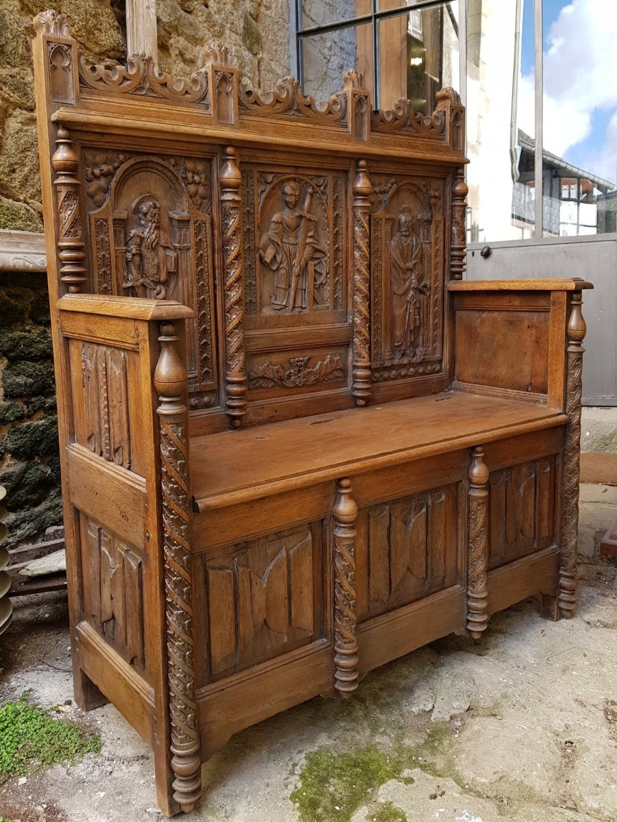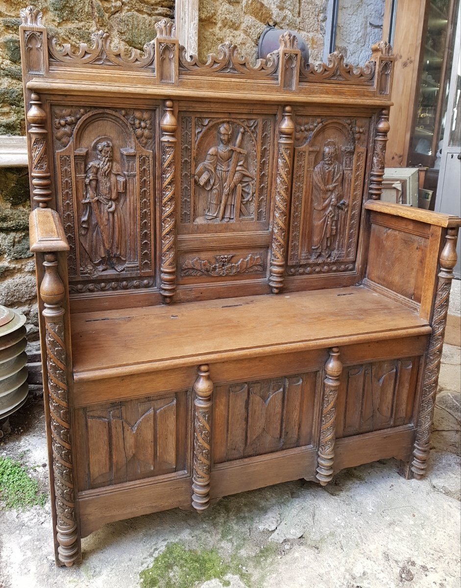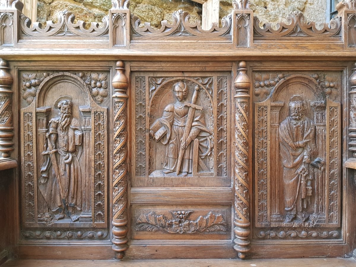 Ławka z rzeźbieniami przedstawiającymi: św. Pawła z mieczem, św. Katarzynę i św. Piotra.