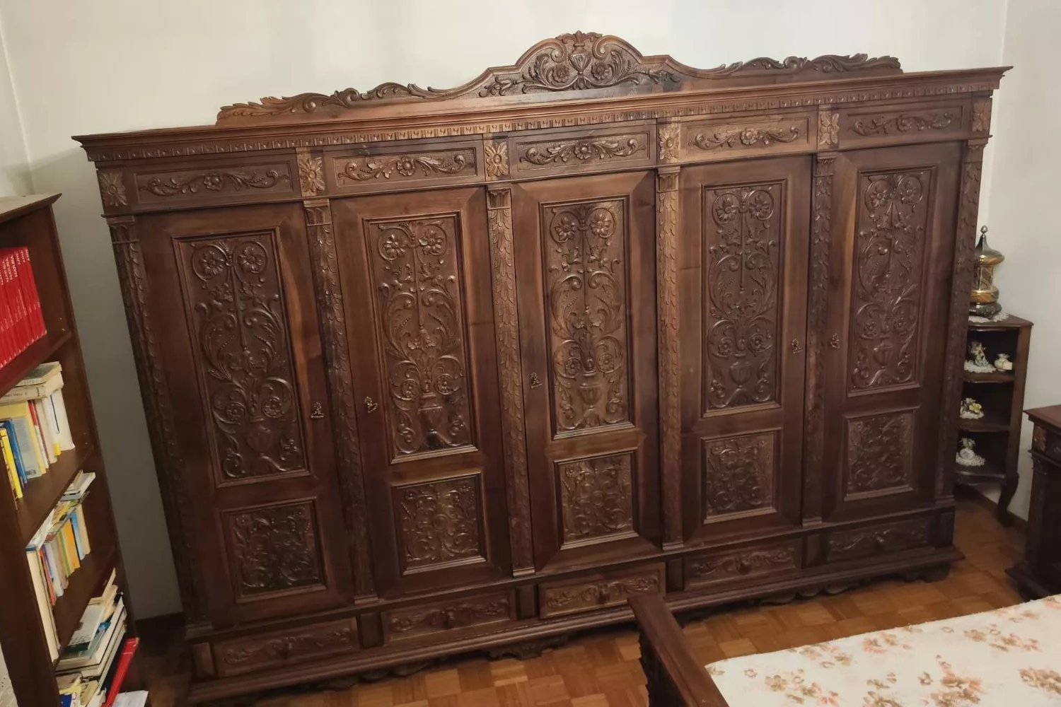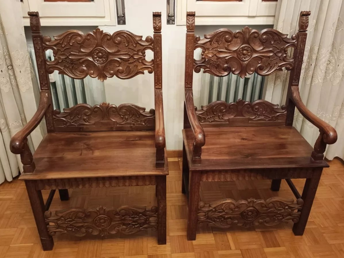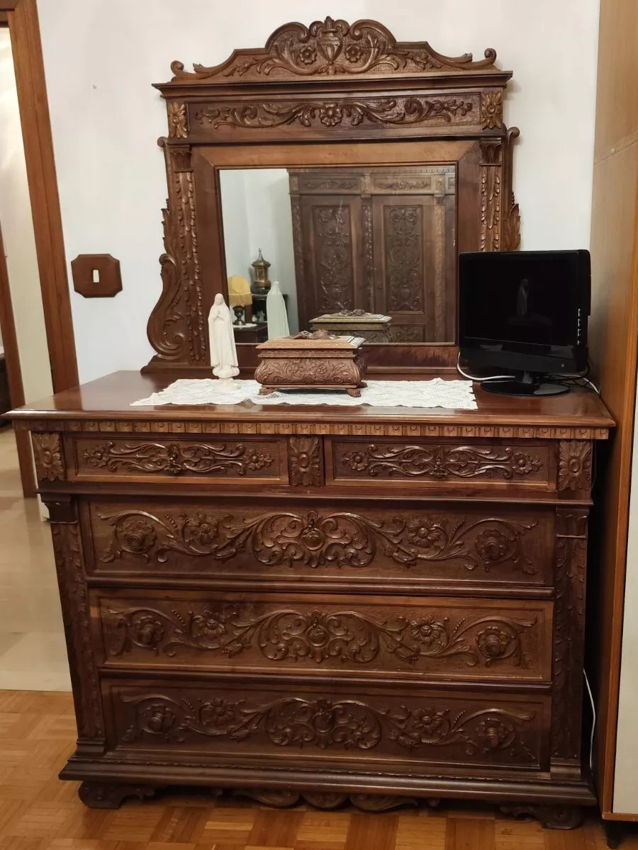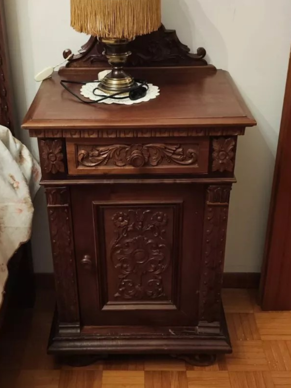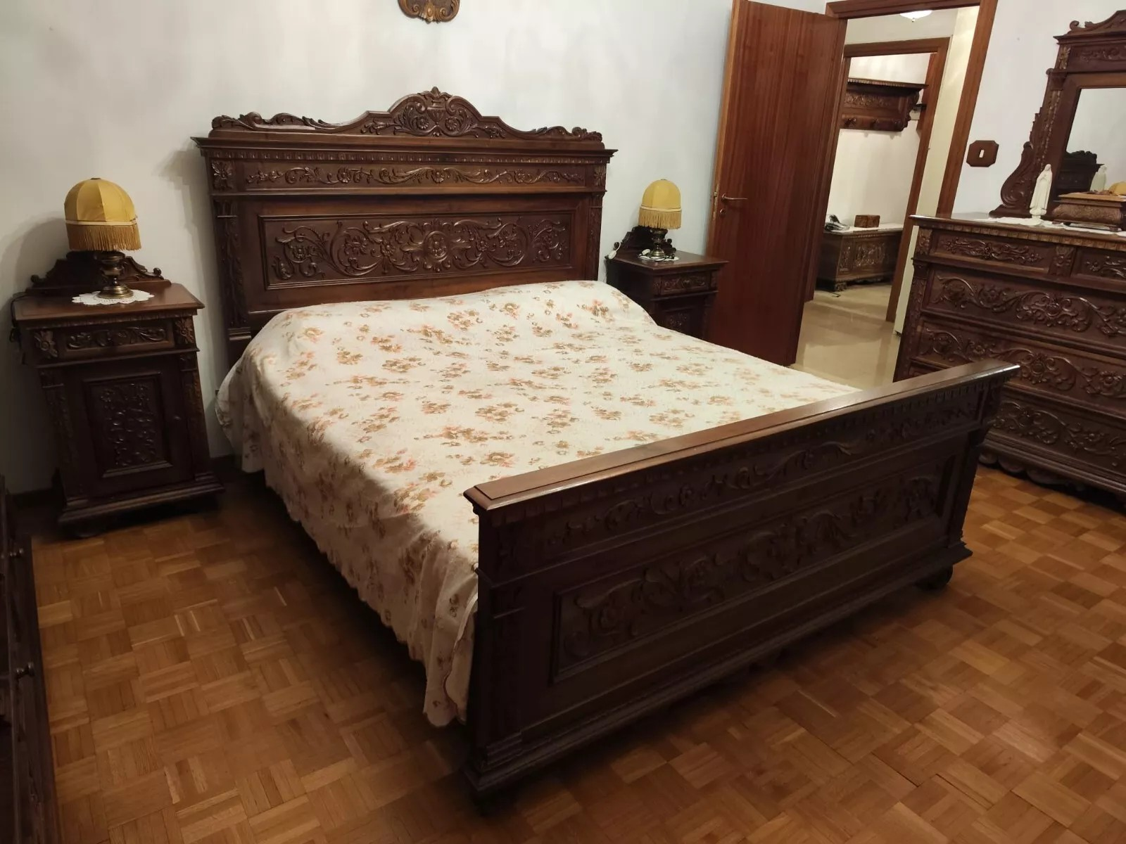 W skład kompletu z drewna orzechowego wchodzi: łoże, 2 x szafka nocna, szafa, komoda z lustrem, 2 x krzesło.