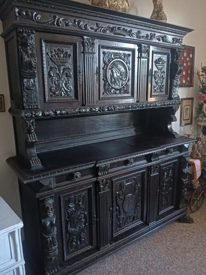 W skład kompletu wchodzi: kredens, pomocnik, stół, 6 x krzesło.