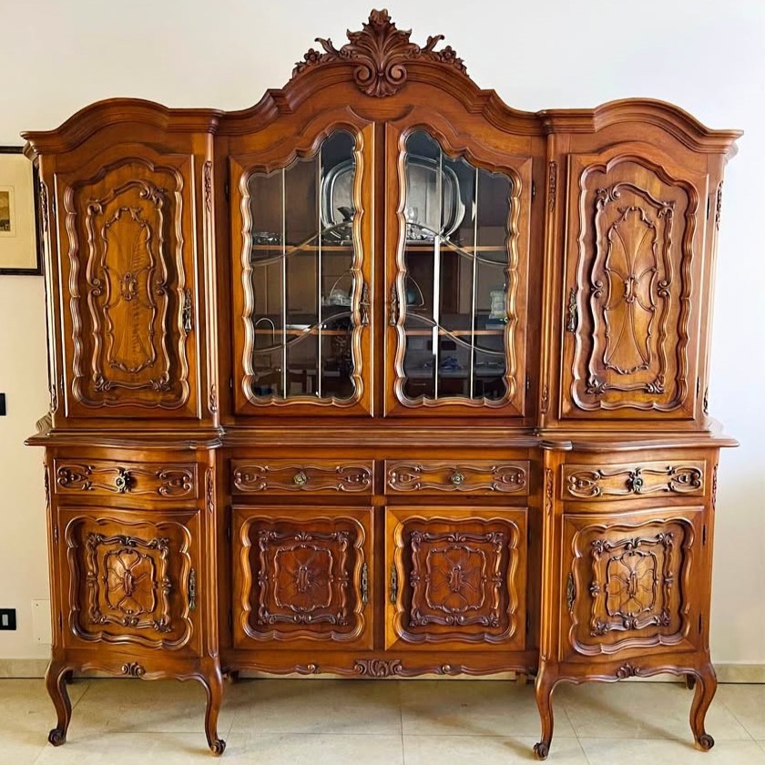 W skład kompletu z drewna orzechowego wchodzi: kredens, stół, 8 x krzesło.