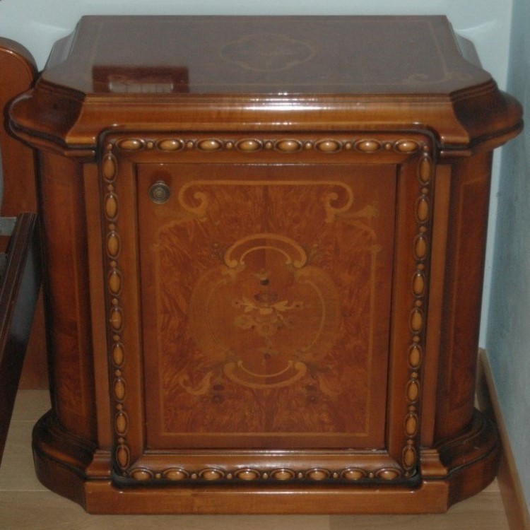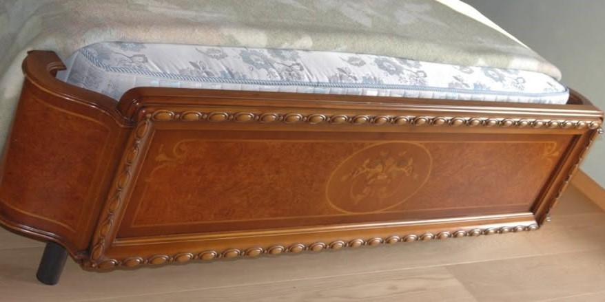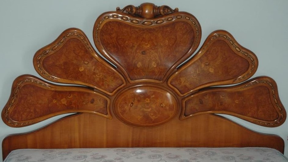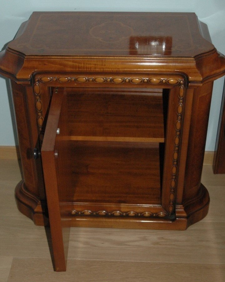 W skład kompletu z drewna orzechowego wchodzi: łoże, para szafek nocnych, komoda.