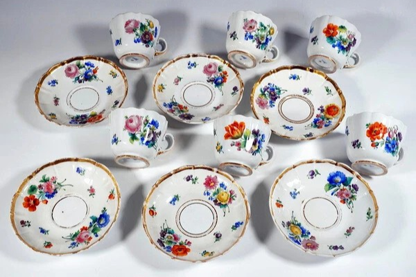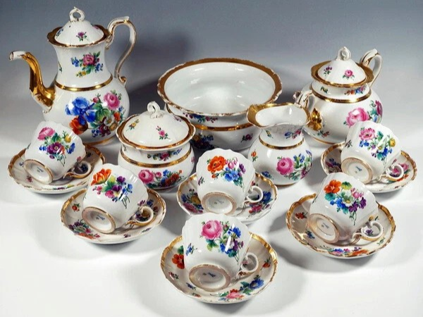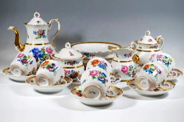 W skład kompletu porcelany miśnieńskiej wchodzi: dzbanek, imbryk, mlecznik, cukiernica, miska, 6 x filiżanka, 6 x spodek.