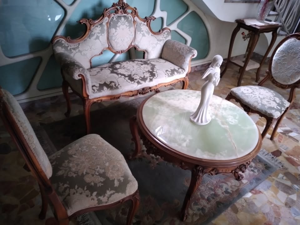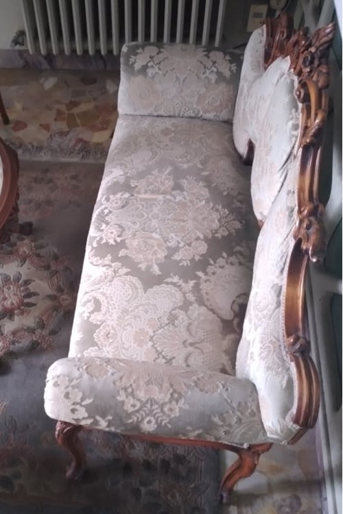 W skład kompletu z drewna mahoniowego wchodzi: sofa 3-osobowa, 2 x krzesło, stolik do kawy (marmurowy blat).