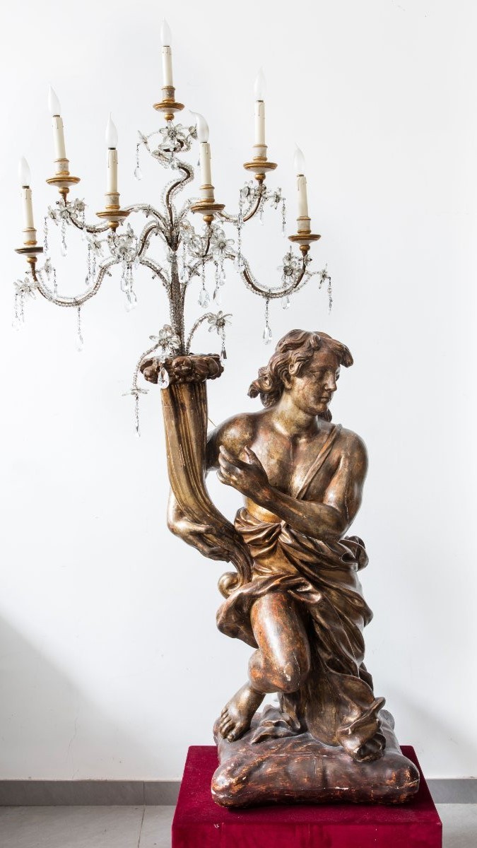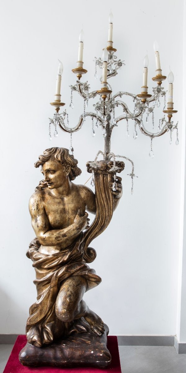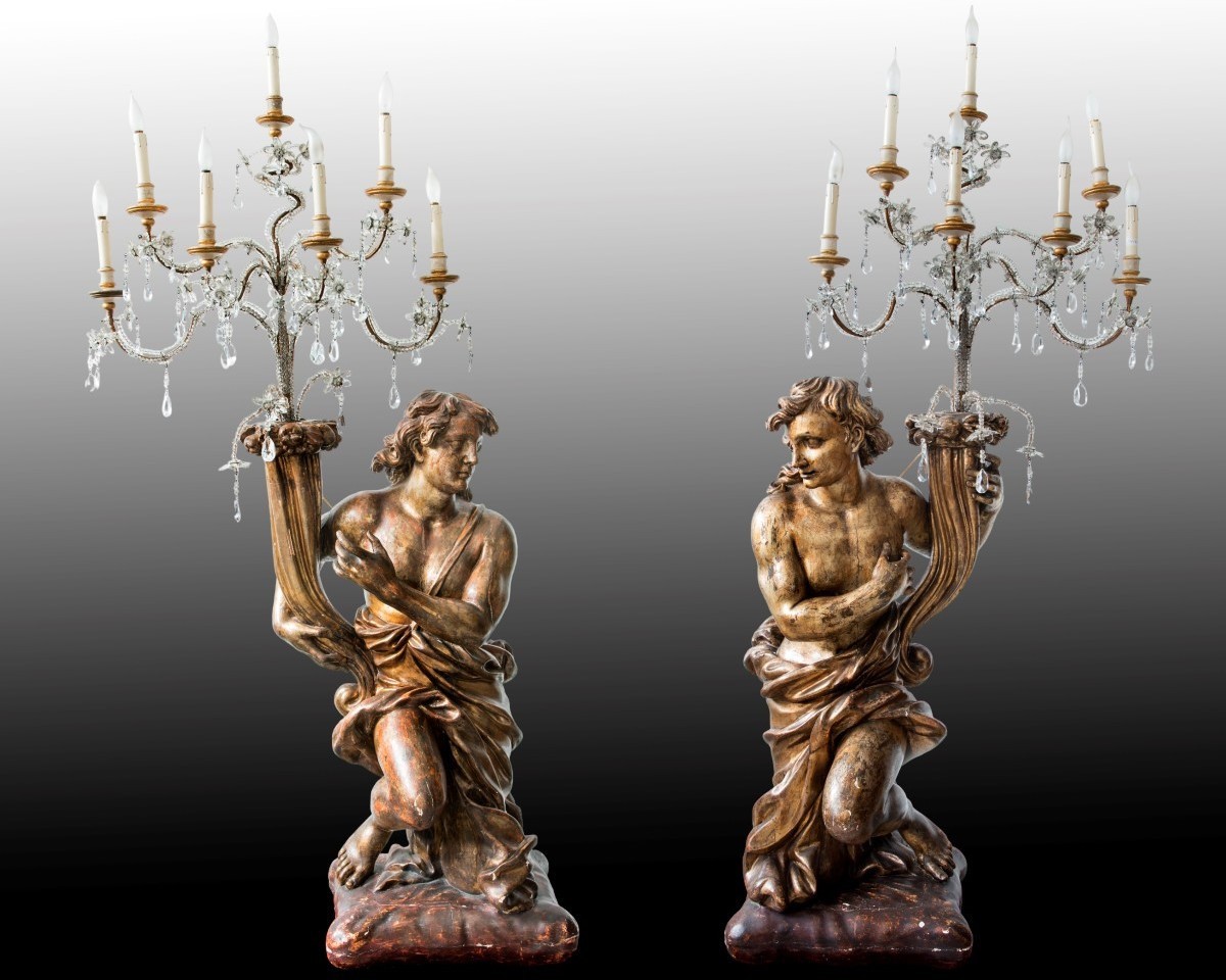 Kandelabry w postaci przyklękniętych mężczyzn z rogami obfitości