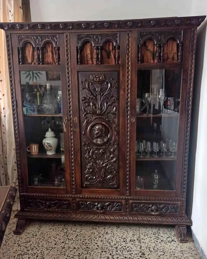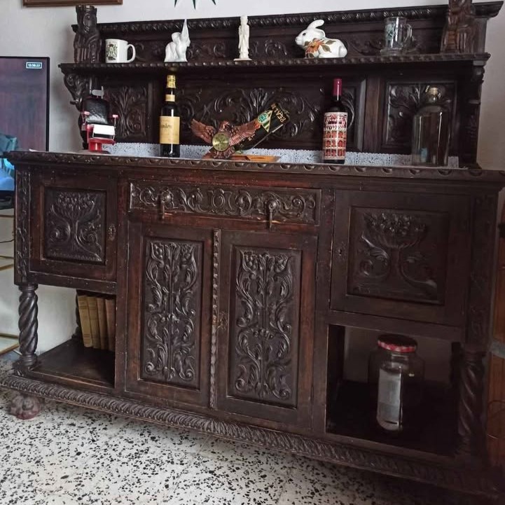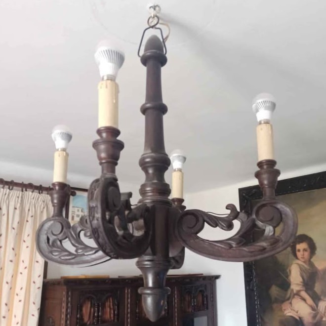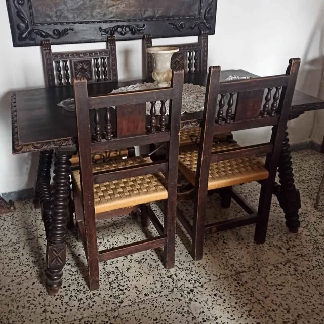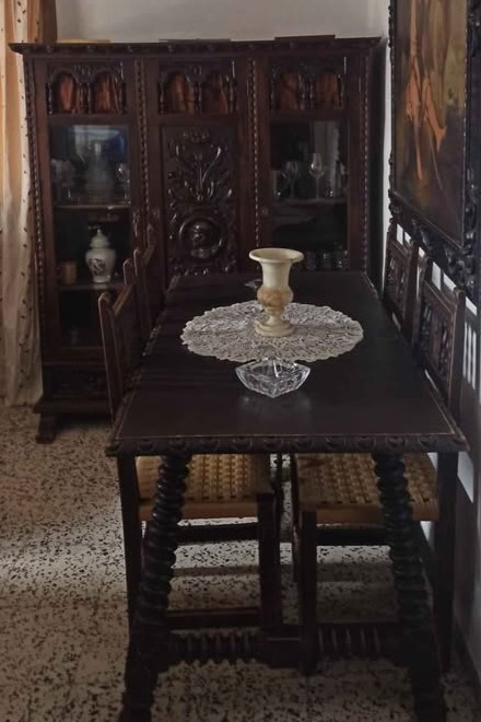 W skład kompletu wchodzi: kredens, pomocnik, stół, 5 x krzesło, żyrandol.