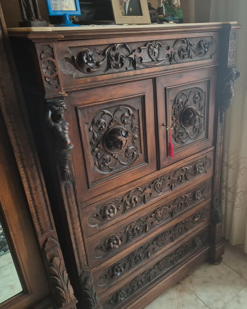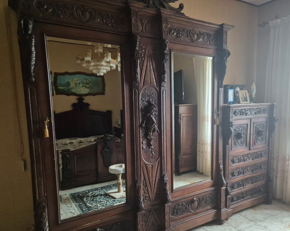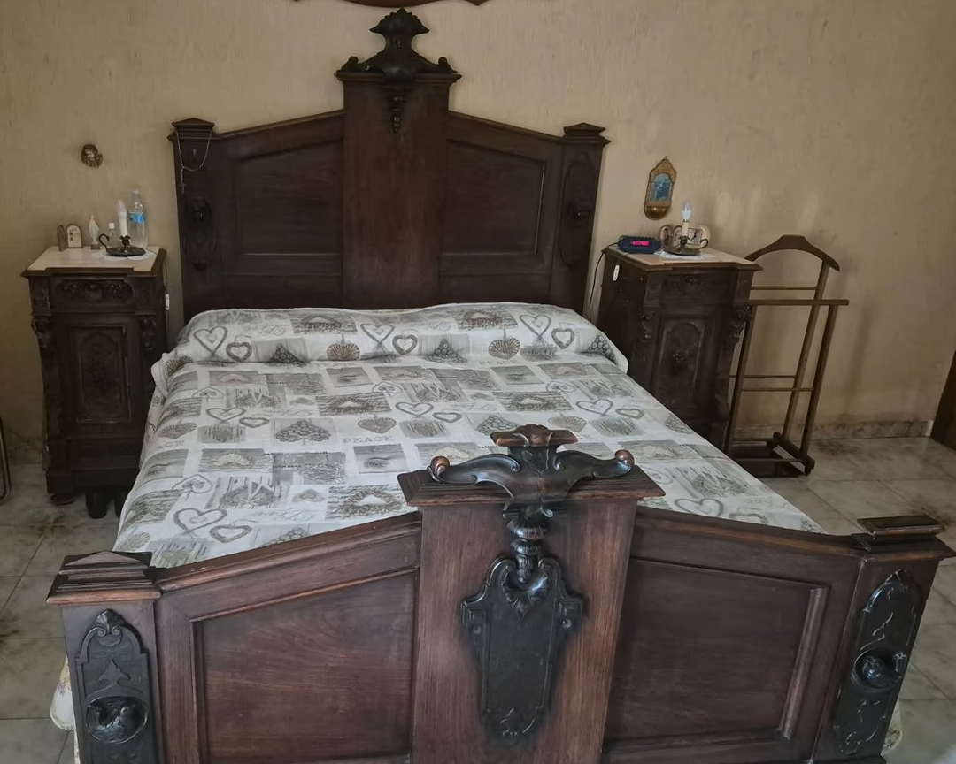 W skład kompletu wchodzi: łoże, 2 x szafka nocna, szafa, 2 x komoda.