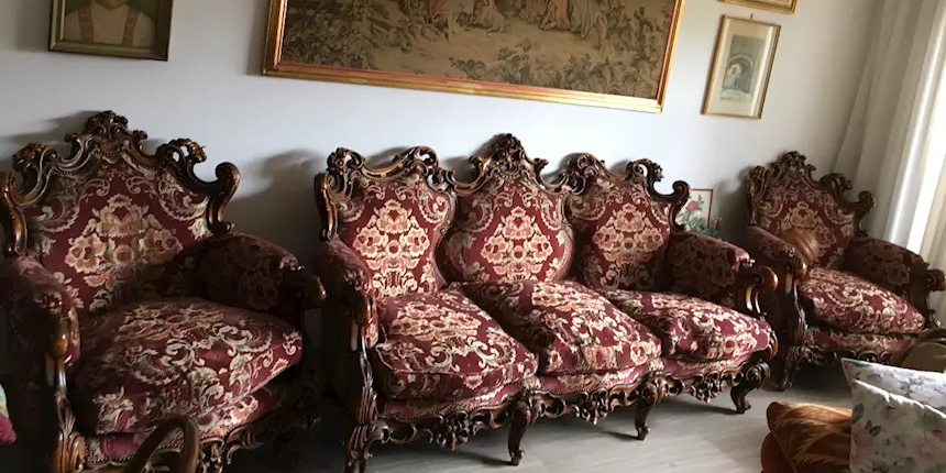W skład kompletu z drewna wchodzi: sofa, 2 x fotel.