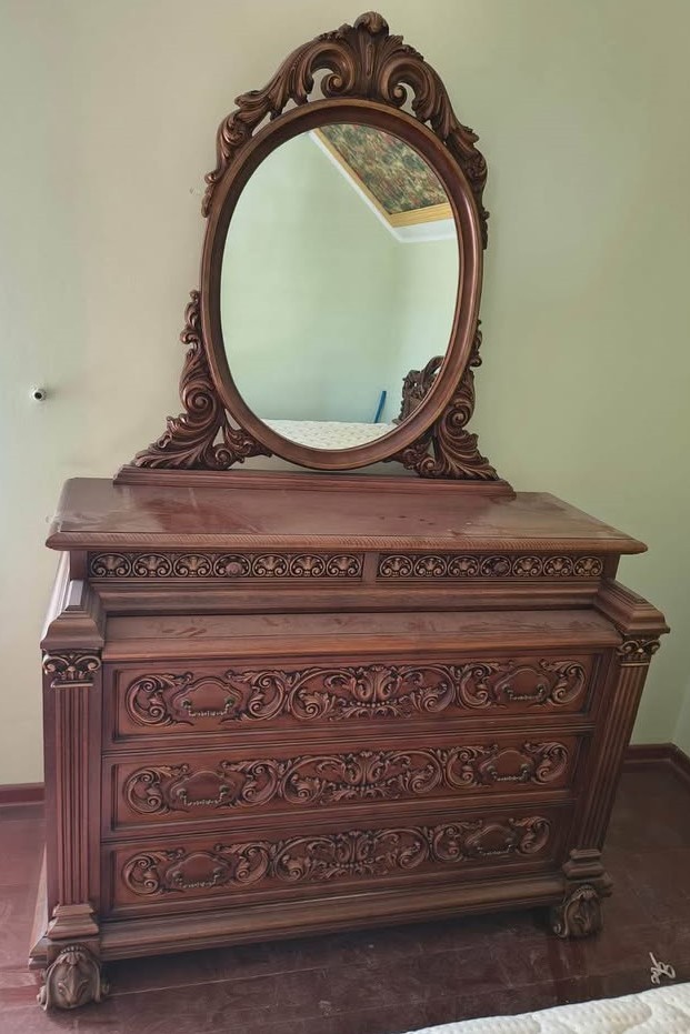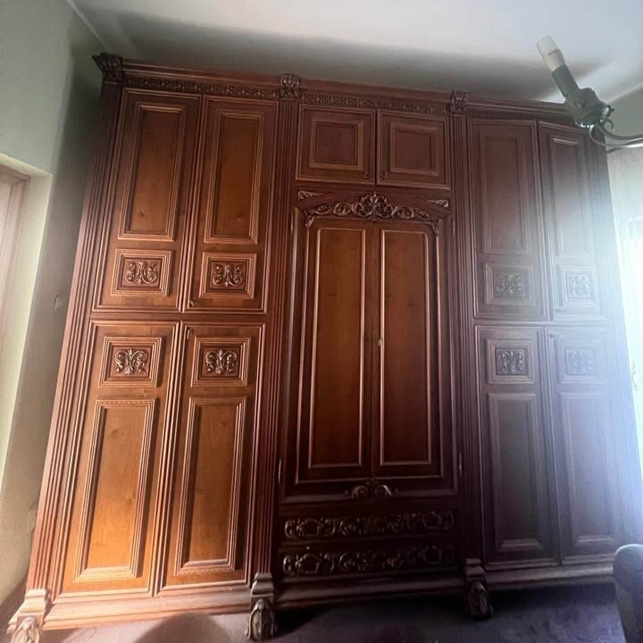 W skład kompletu z drewna wchodzi: łoże, 2 x stolik nocny, szafa, komoda z lustrem.