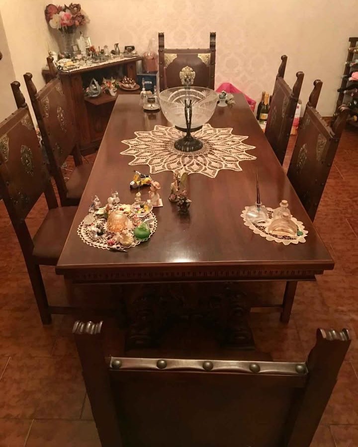 W skład kompletu wchodzi: kredens, stół, 6 x krzesło.