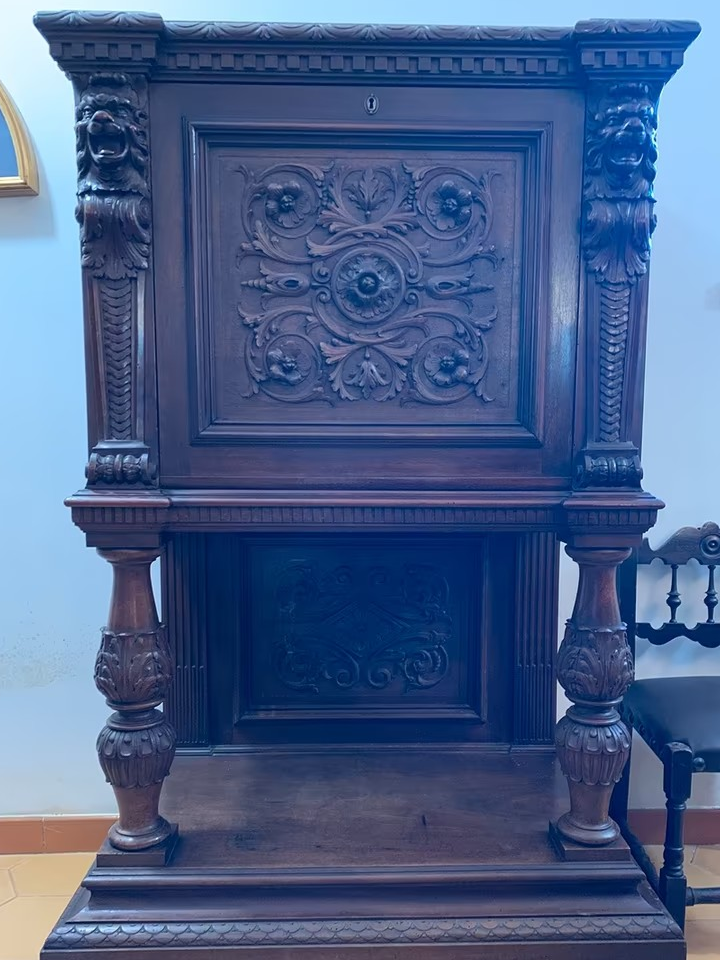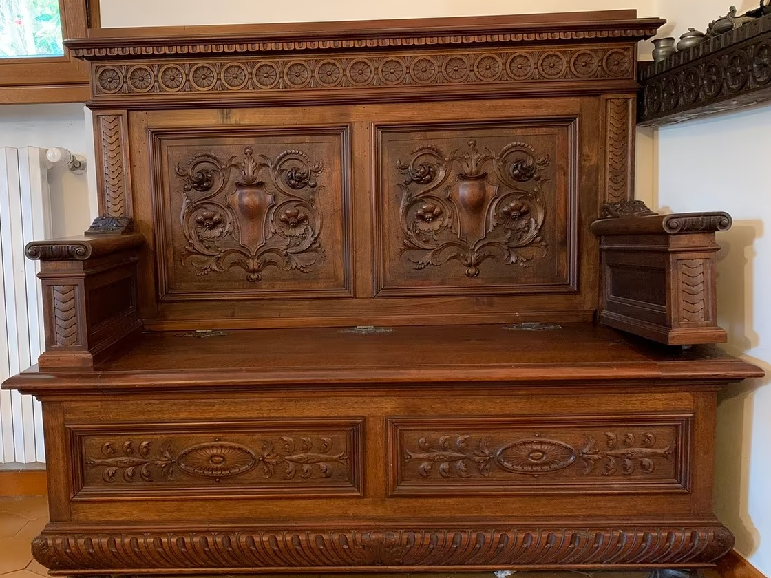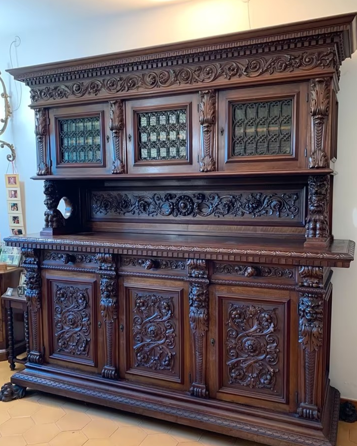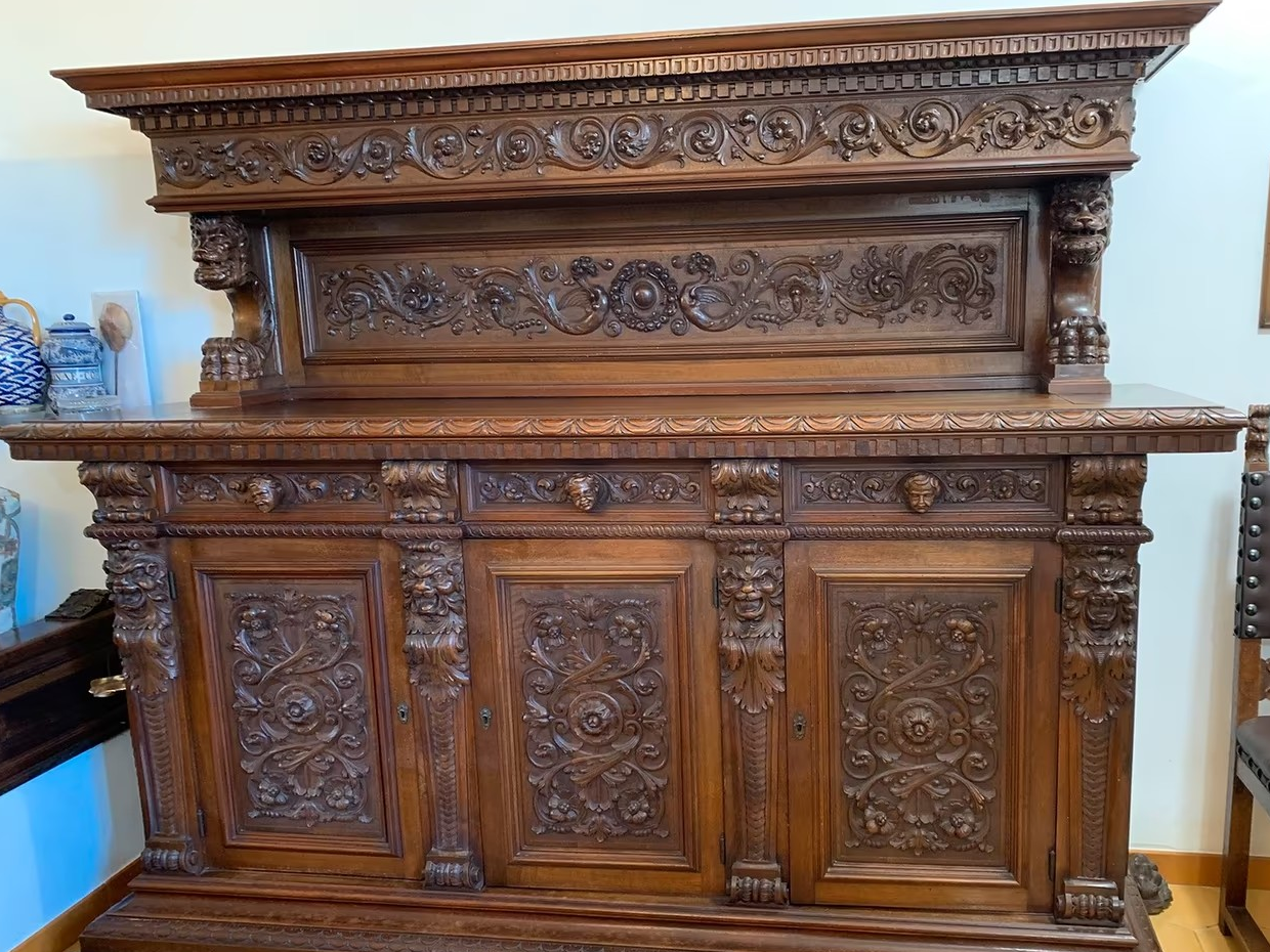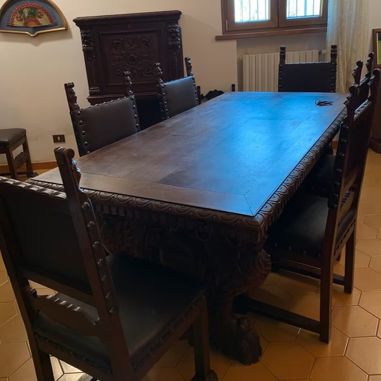 W skład kompletu z drewna wchodzi: kredens, pomocnik, szafka, stół, 8 x krzesło, ławka/skrzynia.