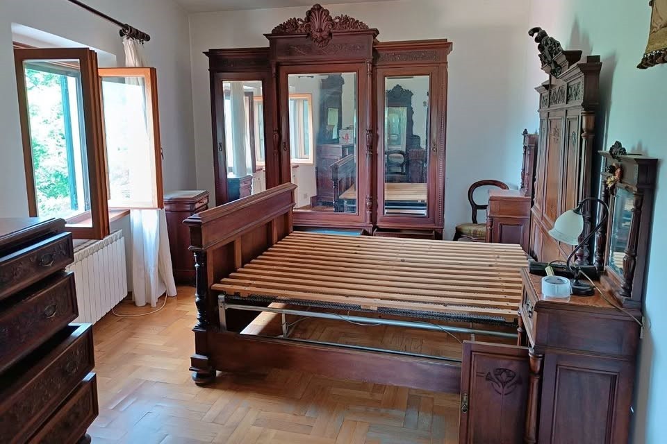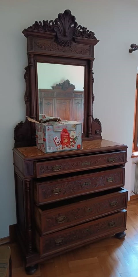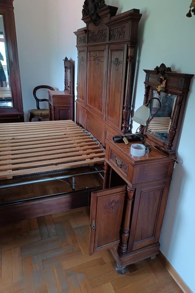 W skład kompletu wchodzi: łoże, 2 x szafka nocna, szafa, komoda z lustrem, toaletka.
