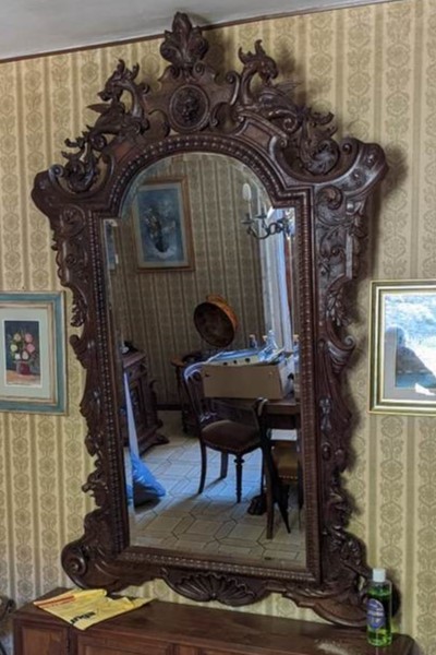 W skład kompletu wchodzi: pomocnik, pomocnik z lustrem, duże lustro (200 cm), stół, 6 x krzesło.
