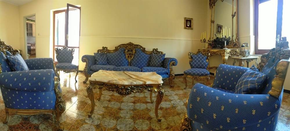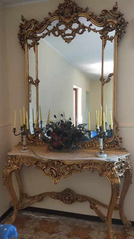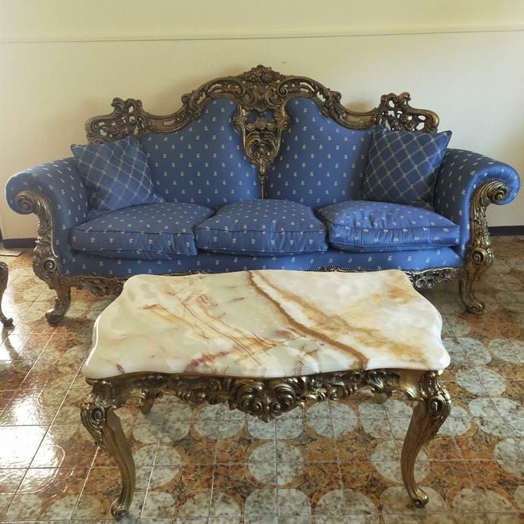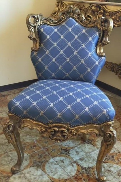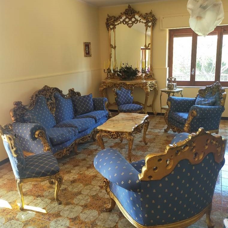 W skład kompletu wchodzi: sofa 3-osobowa, 2 x fotel, 2 x krzesło, stolik do kawy, konsola z lustrem, stolik boczny.