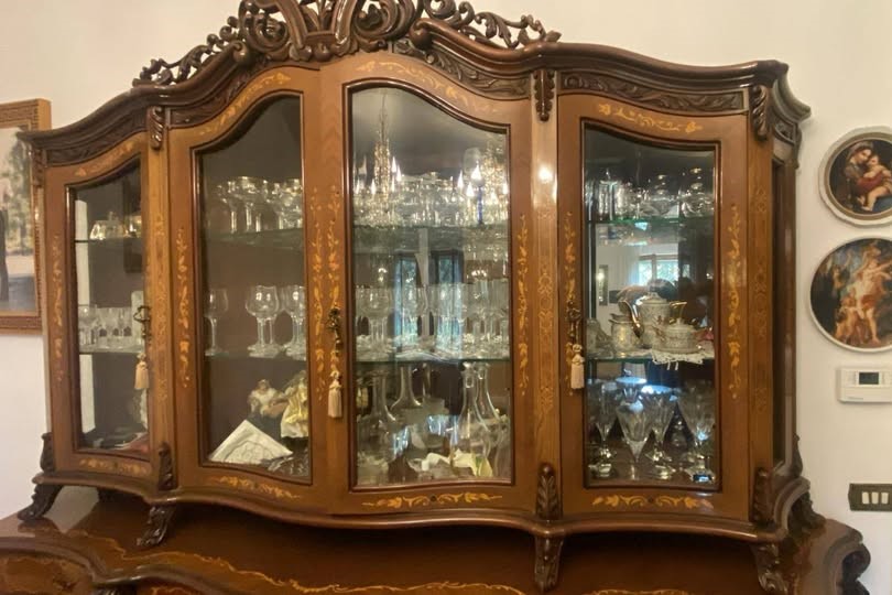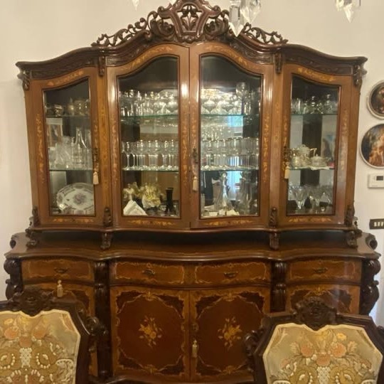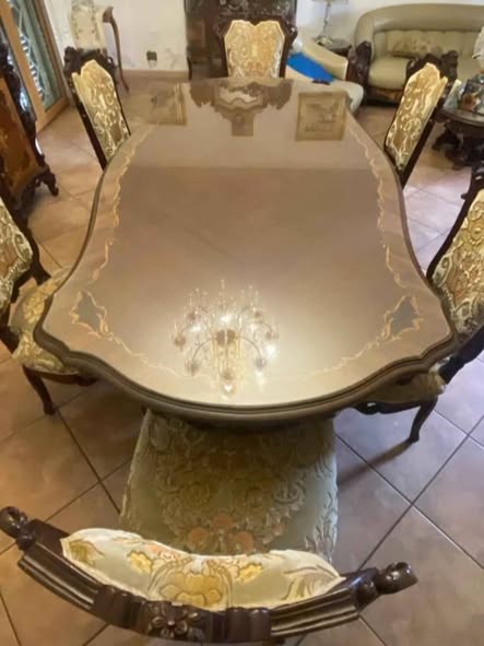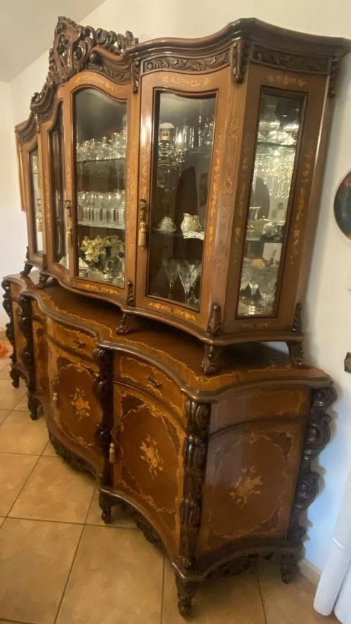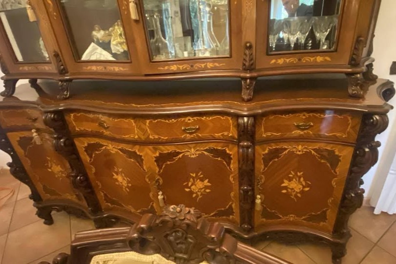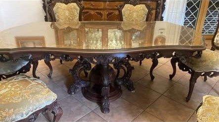 W skład kompletu z drewna wchodzi: kredens, stół, 6 x krzesło.