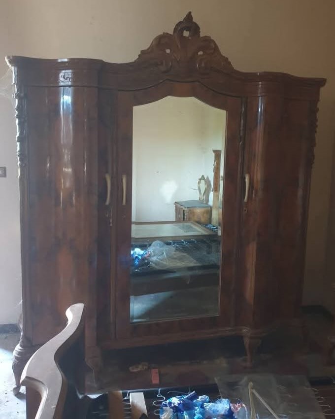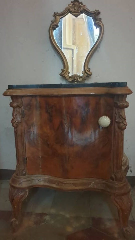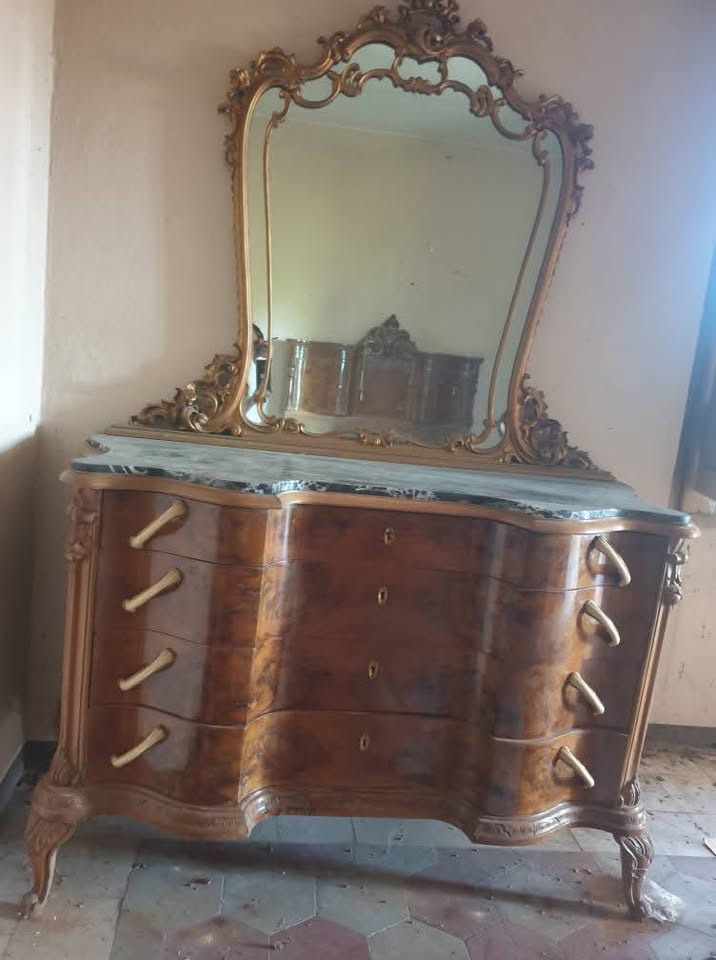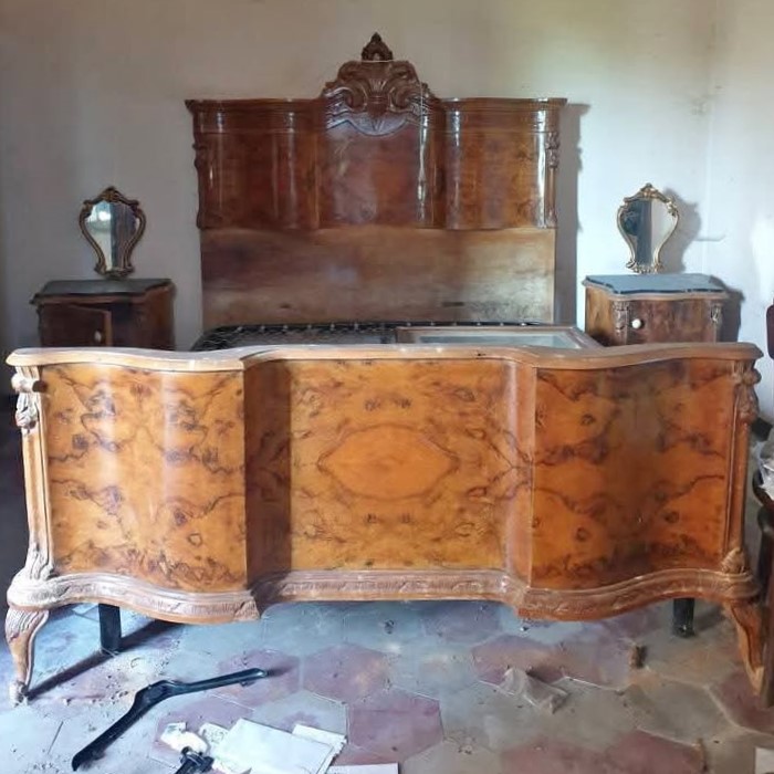 W skład kompletu z drewna/marmuru wchodzi: łoże, para szafek nocnych z lustrami, szafa z lustrem, komoda z lustrem.