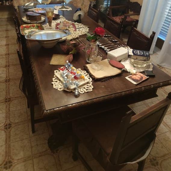 W skład kompletu wchodzi: kredens, stół, 2 x fotel, 8 x krzesło.