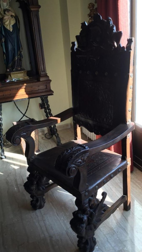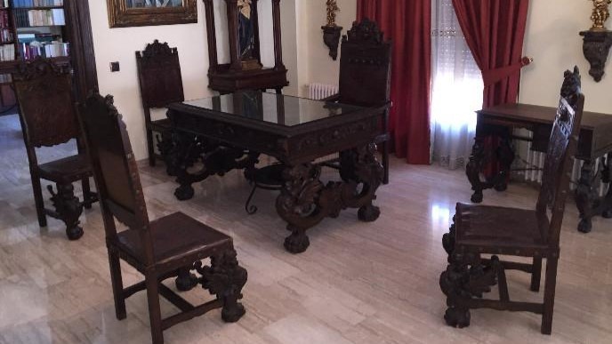 W skład kompletu z drewna orzechowego wchodzi: biblioteka, biurko, fotel, 4 x krzesło, stolik, żyrandol.