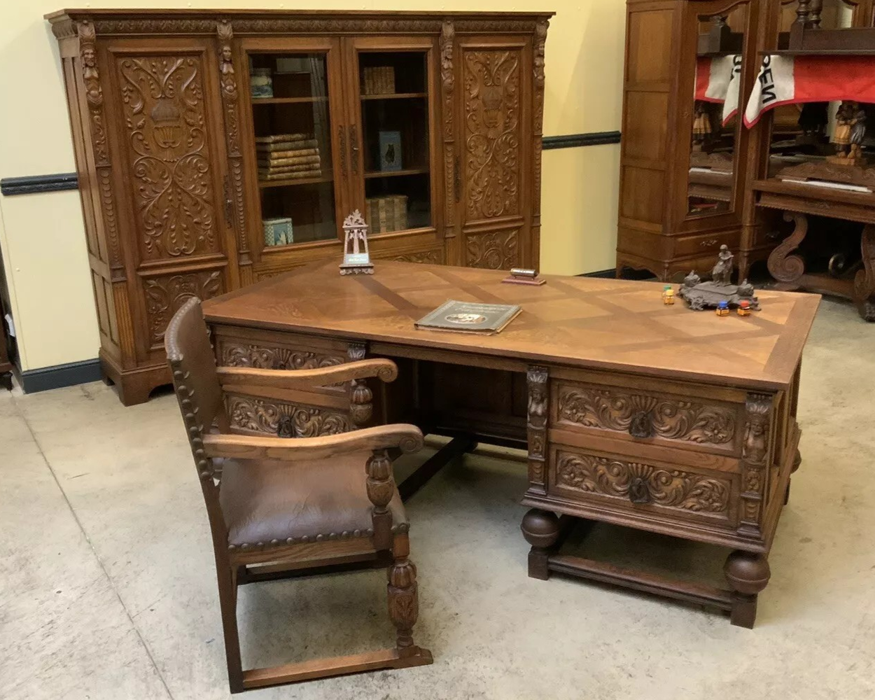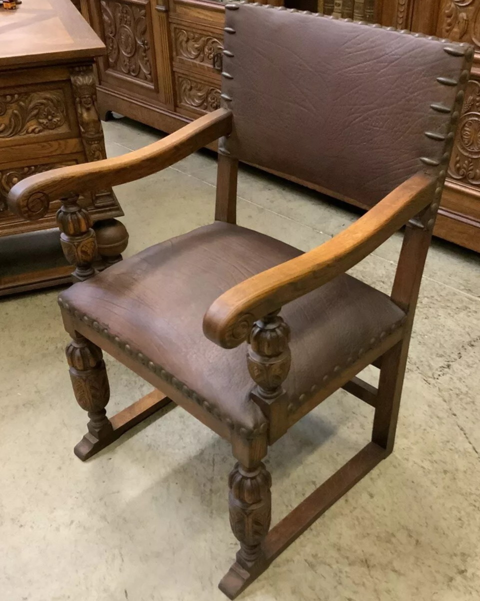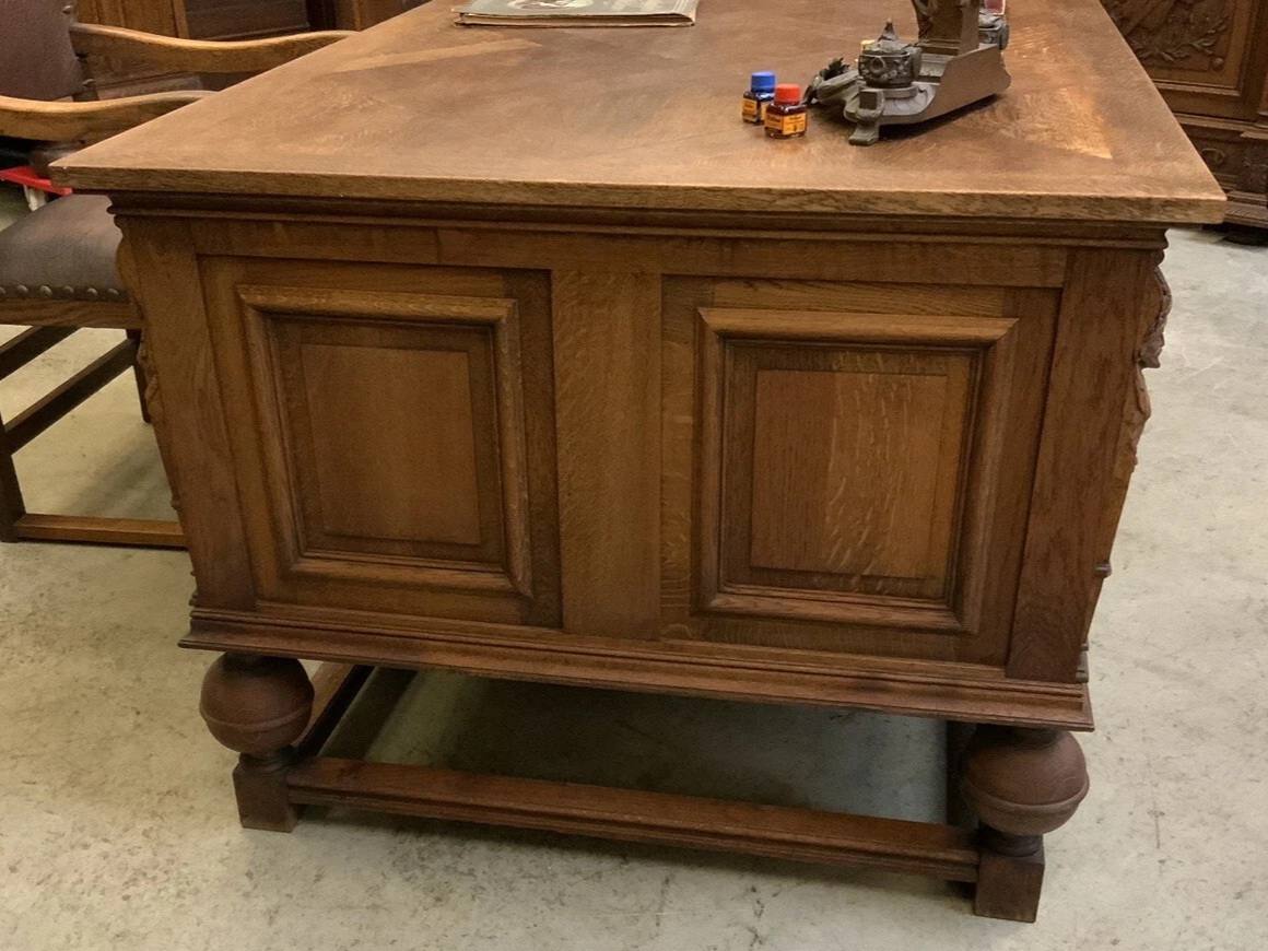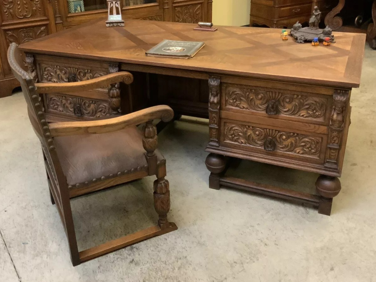 W skład kompletu z drewna dębowego wchodzi: biblioteka, biurko, fotel.