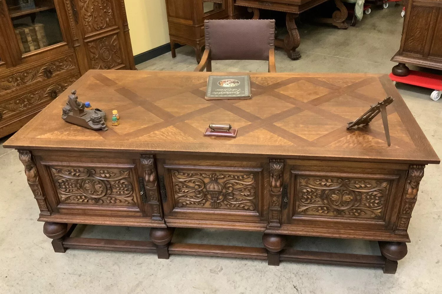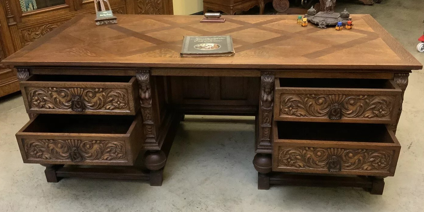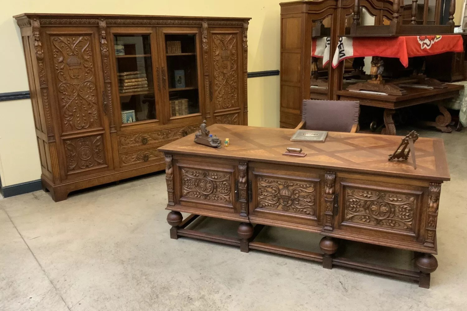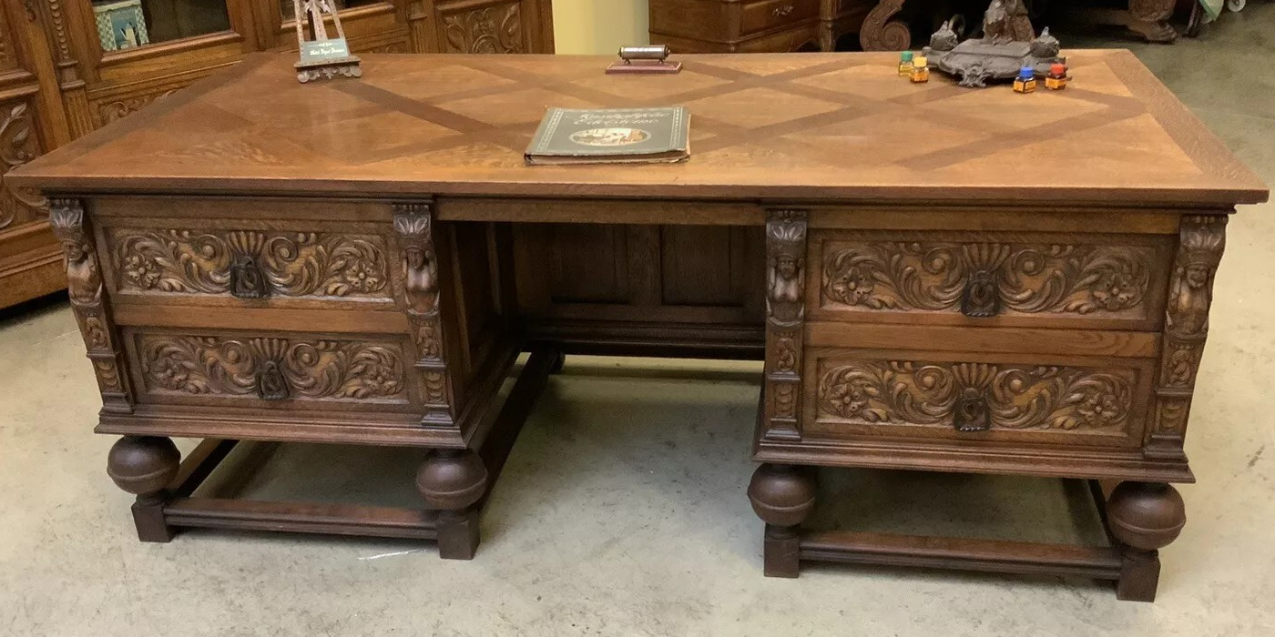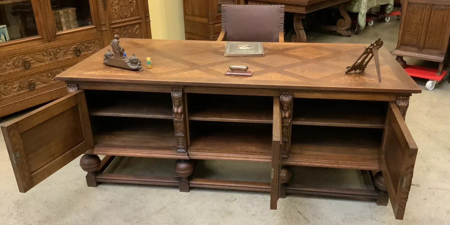 W skład kompletu z drewna dębowego wchodzi: biblioteka, biurko, fotel.