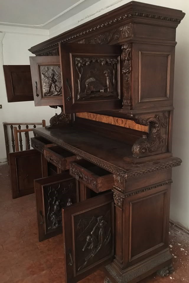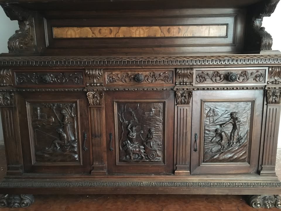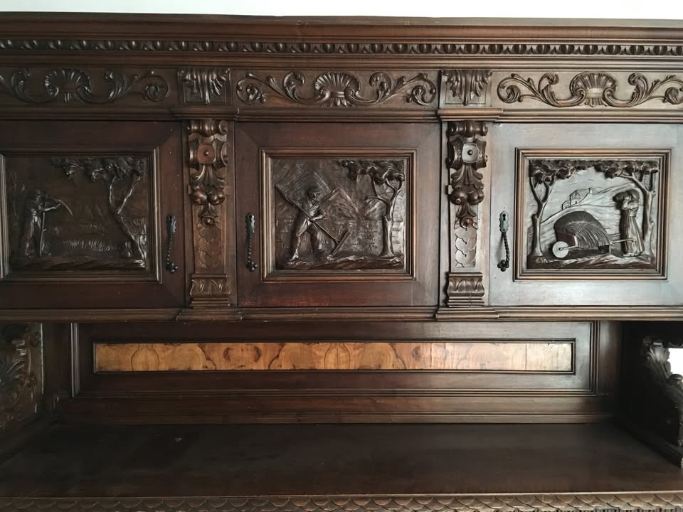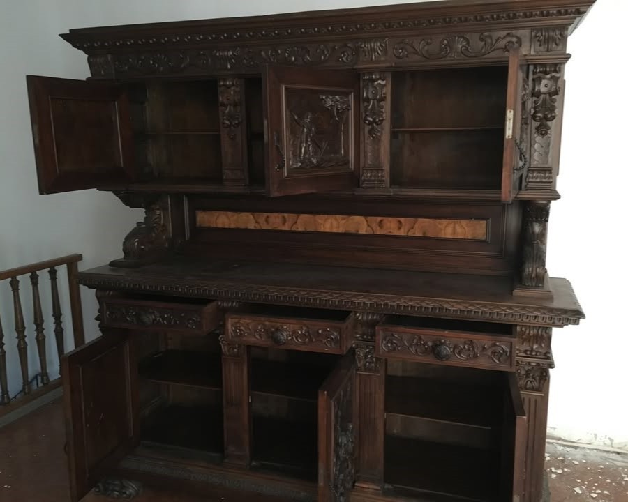 W skład kompletu z drewna orzechowego wchodzi: kredens, pomocnik, stół, 6 x krzesło.