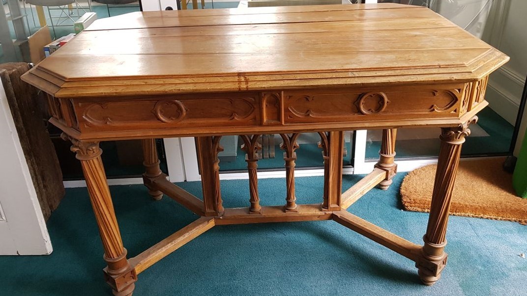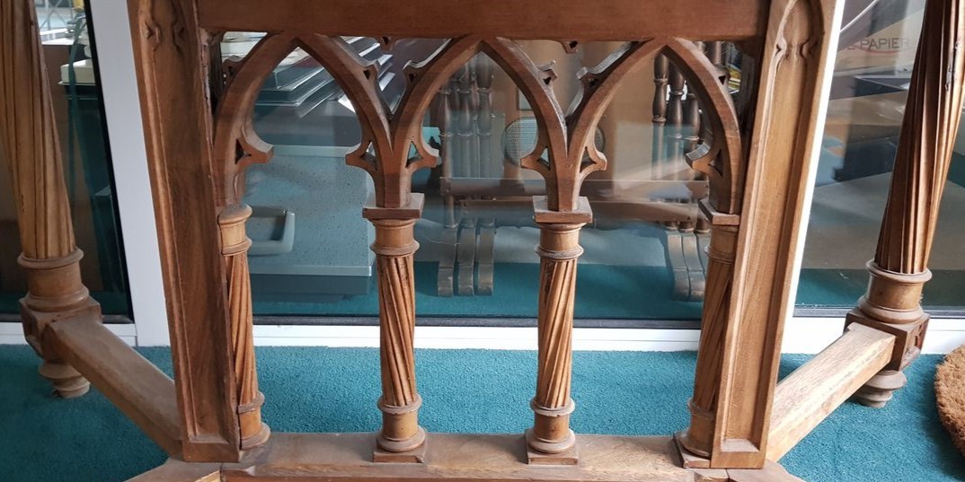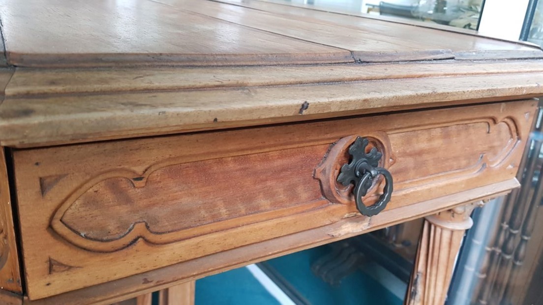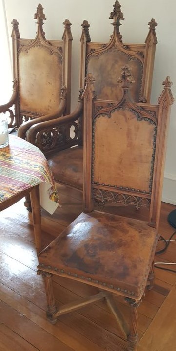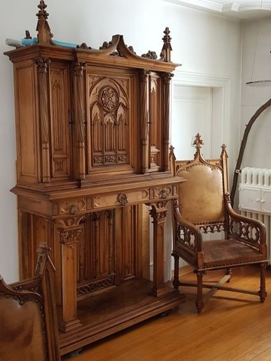 W skład kompletu z drewna wchodzi: szafka, stół, 3 x fotel, 3 x krzesło.
