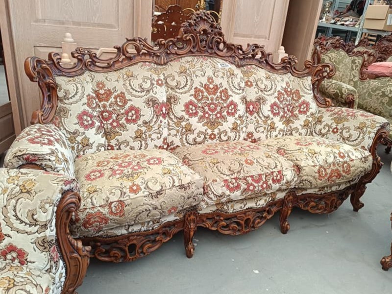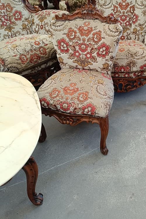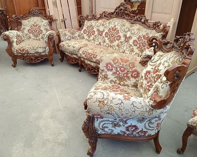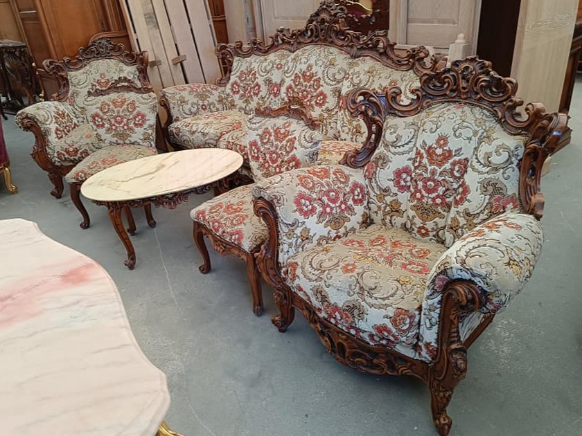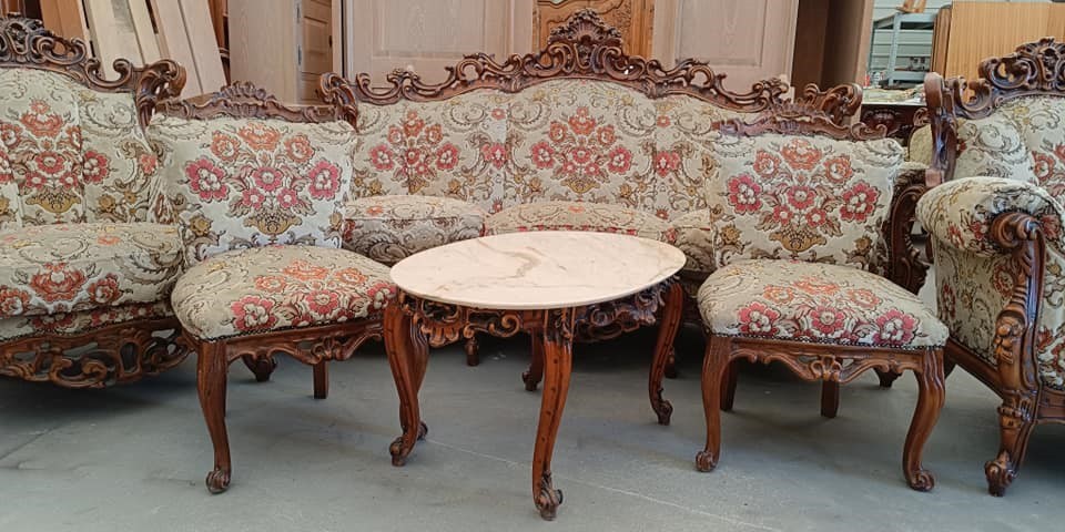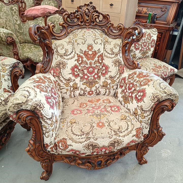 W skład kompletu wchodzi: sofa, 2 x fotel, 2 x krzesło, stolik do kawy.