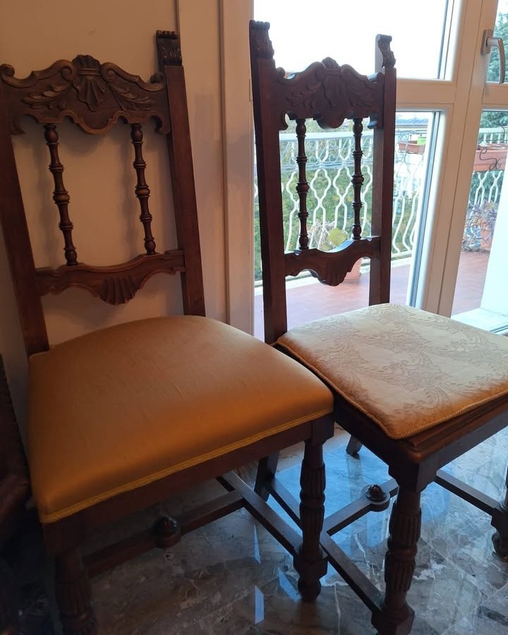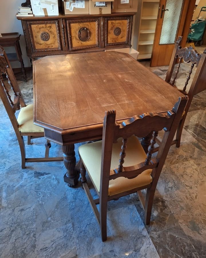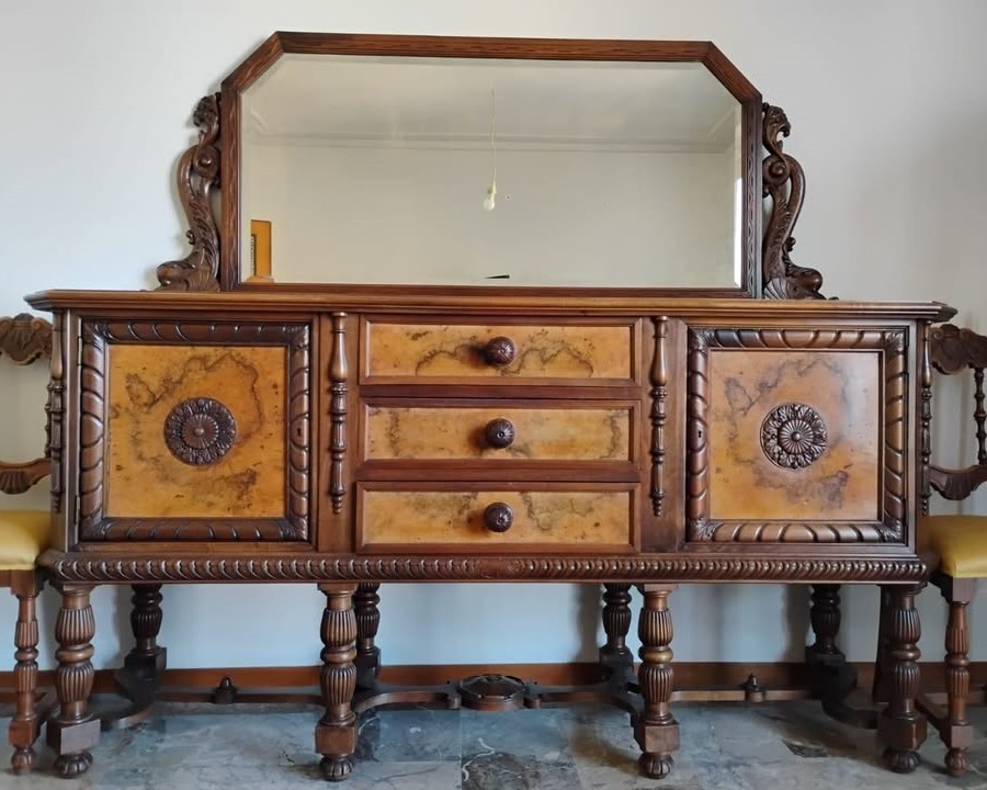 W skład kompletu z drewna orzechowego wchodzi: para szafek bufetowych z lustrem, rozkładany stół, 8 x krzesło.