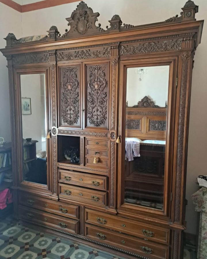 W skład kompletu z drewna orzechowego wchodzi: łoże, 2 x szafka nocna, szafa.