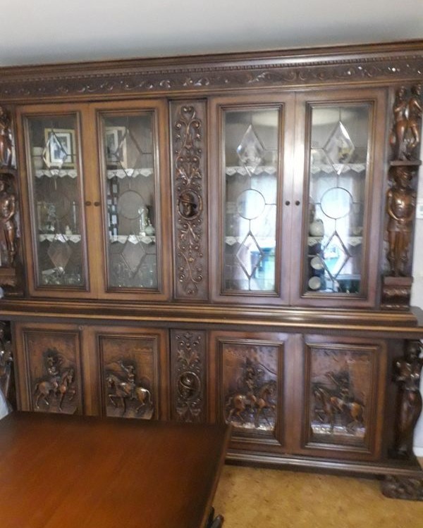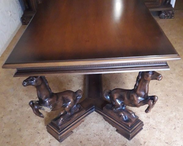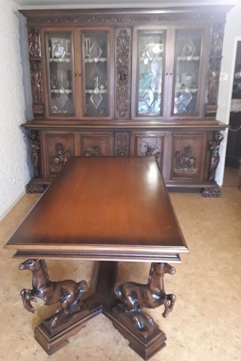W skład kompletu wchodzi: stół na koniach, kredens, bufet z lustrem.