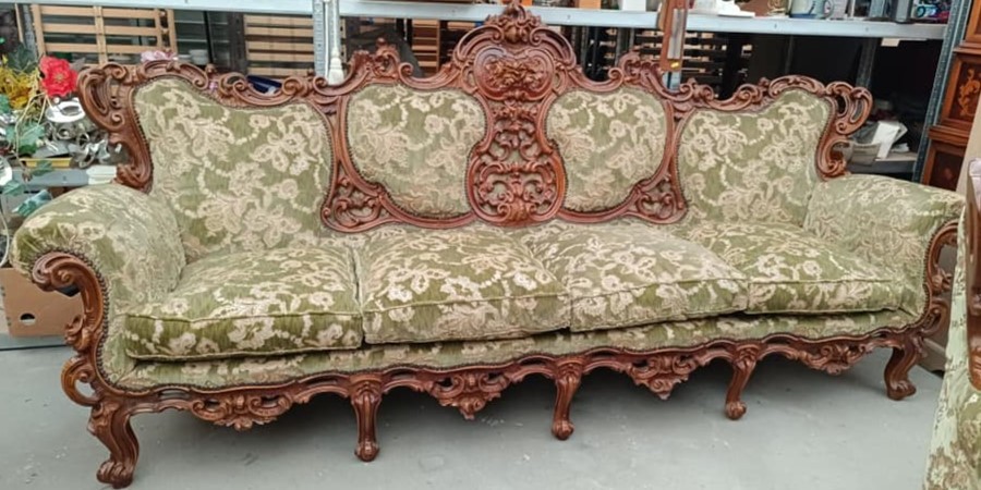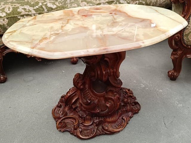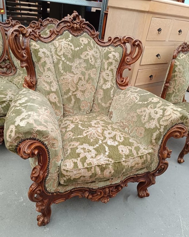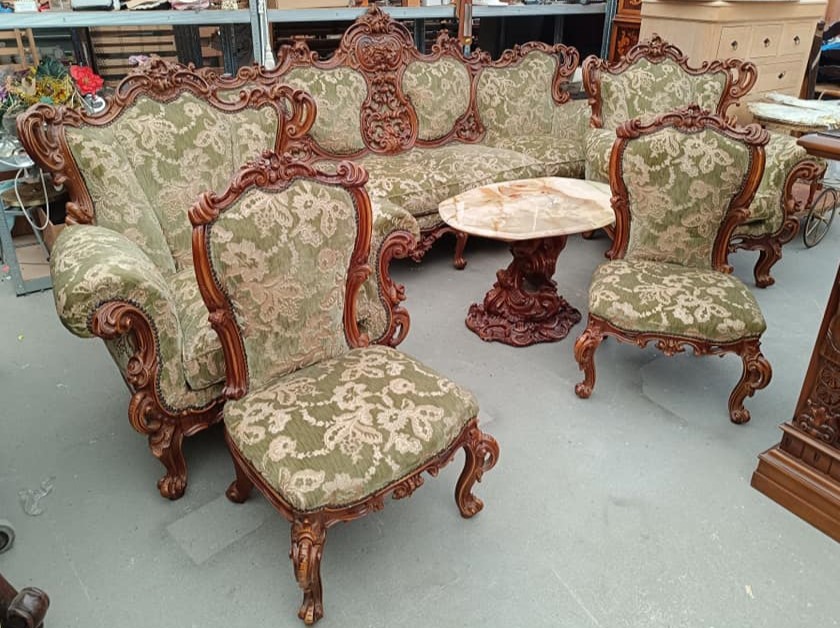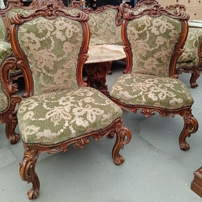 W skład kompletu wchodzi: sofa, 2 x fotel, 2 x krzesło, stolik do kawy.