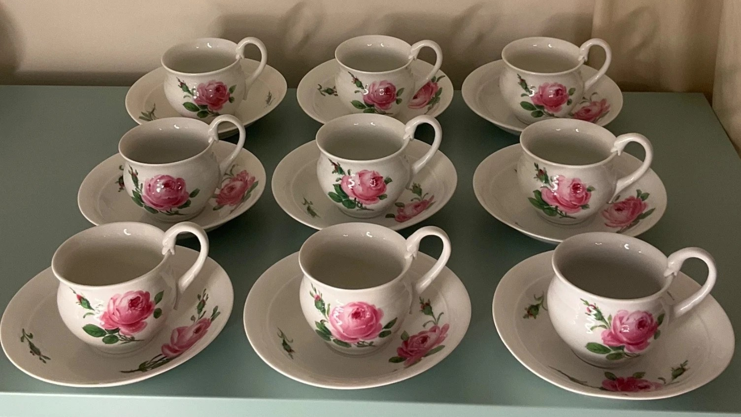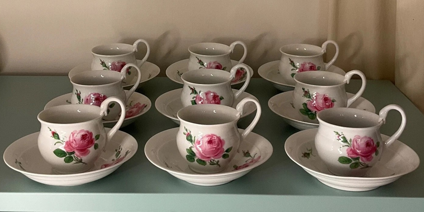 W skład kompletu porcelany miśnieńskiej wchodzi: 9 x filiżanka, 9 x spodek.