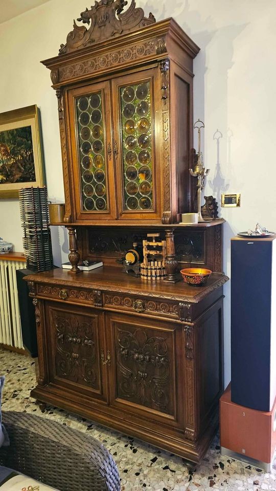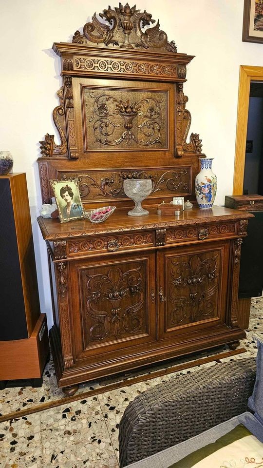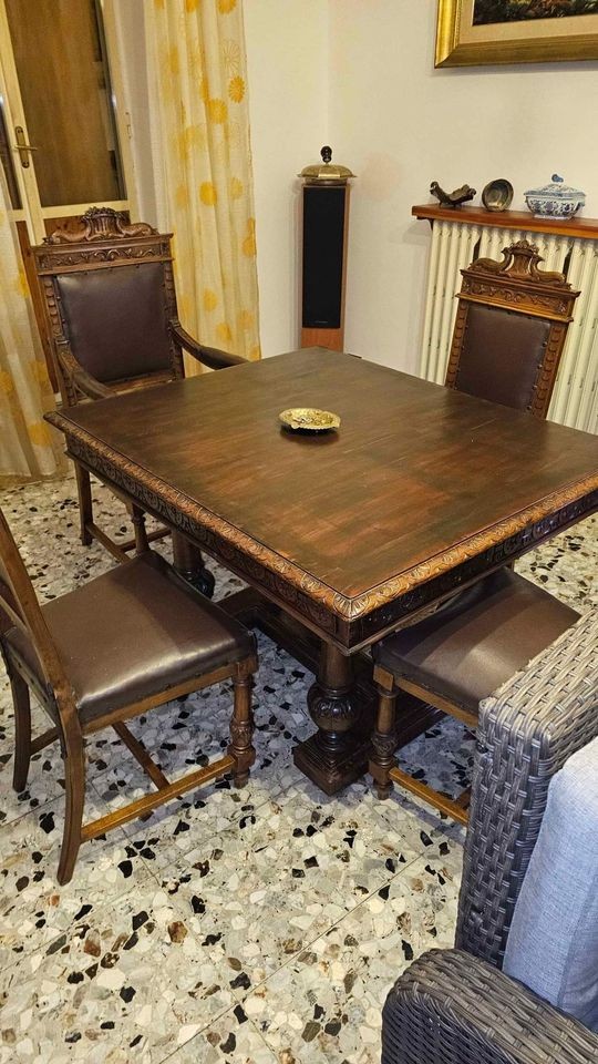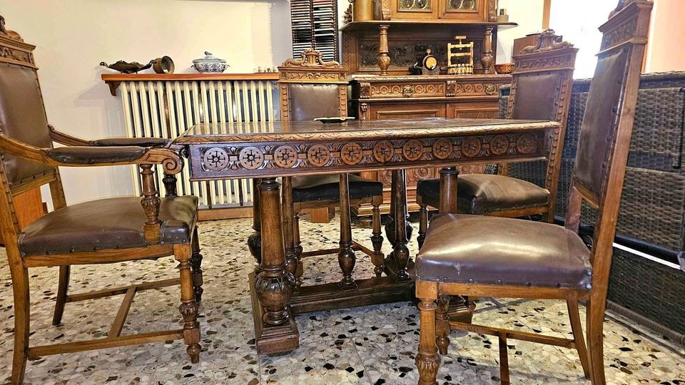 W skład kompletu wchodzą: 2 x kredens, rozsuwany stół, 8 x krzesło.