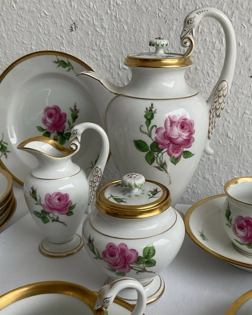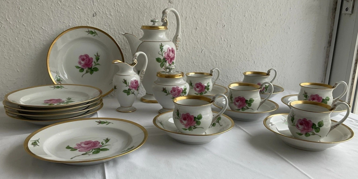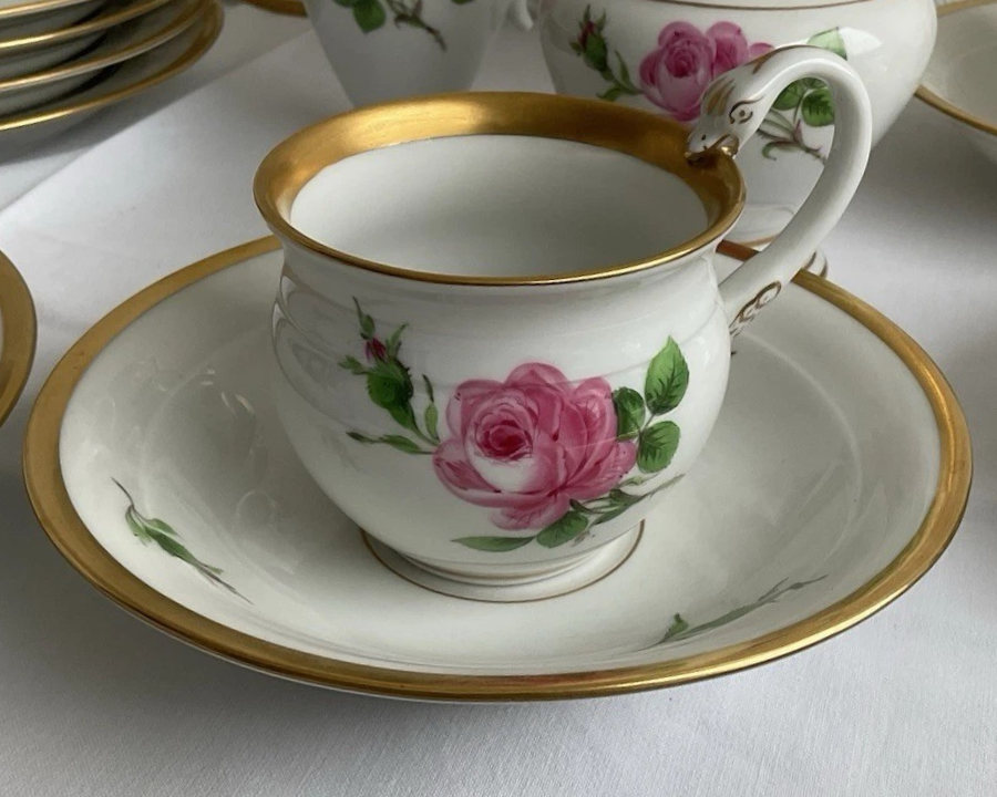 W skład kompletu porcelany miśnieńskiej wchodzi: dzbanek do kawy, mlecznik, cukierniczka, 6 x filiżanka, 6 x spodek, 6 x talerzyk deserowy.