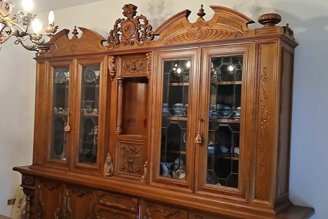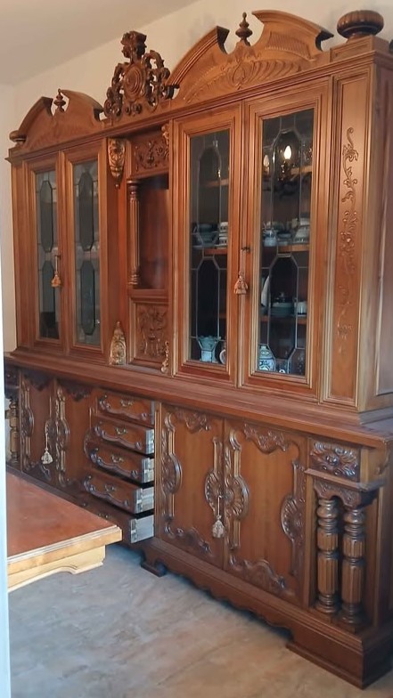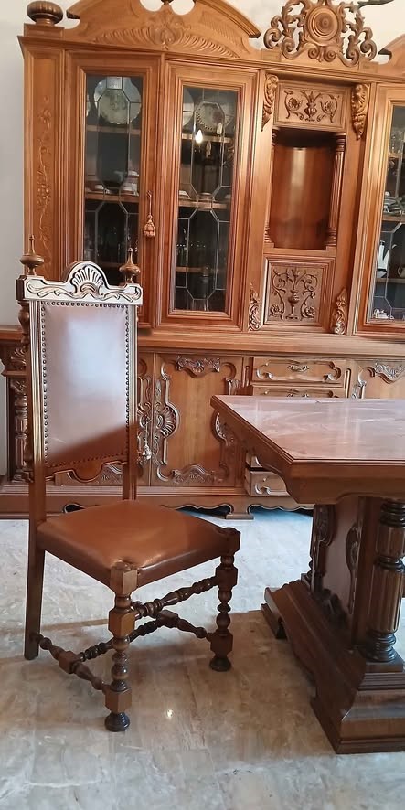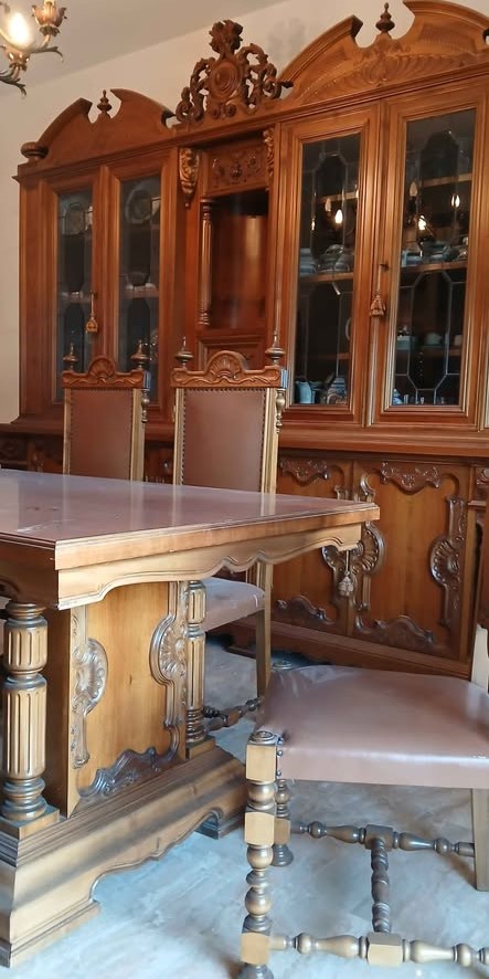 W skład kompletu z drewna wchodzi: duży kredens, stół, 6 x krzesło.