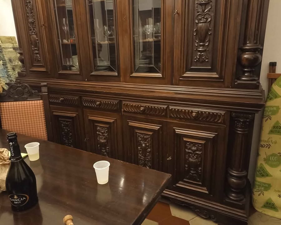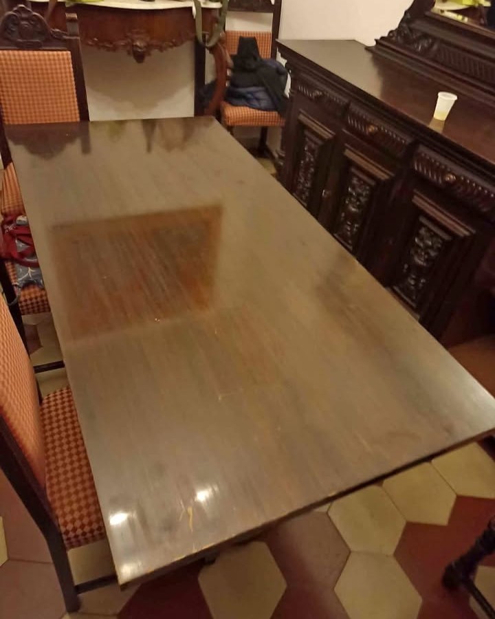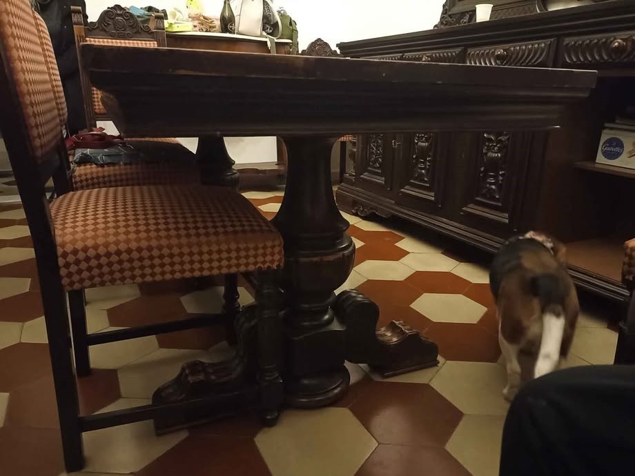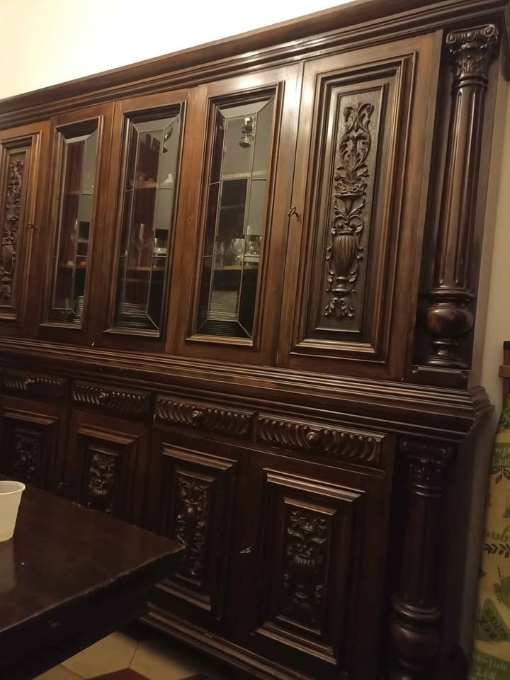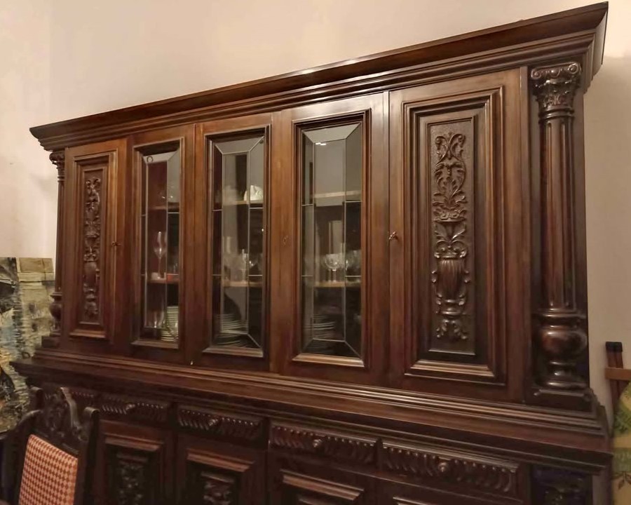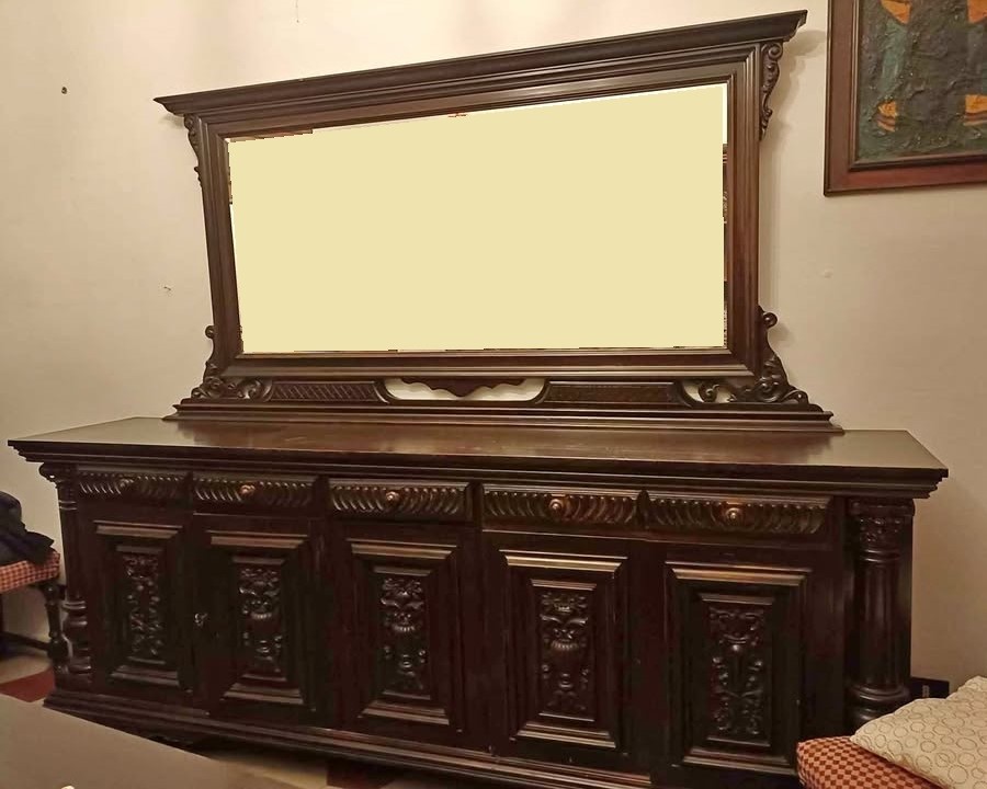 W skład kompletu wchodzi: kredens, bufet z lustrem, stół, 8 x krzesło.