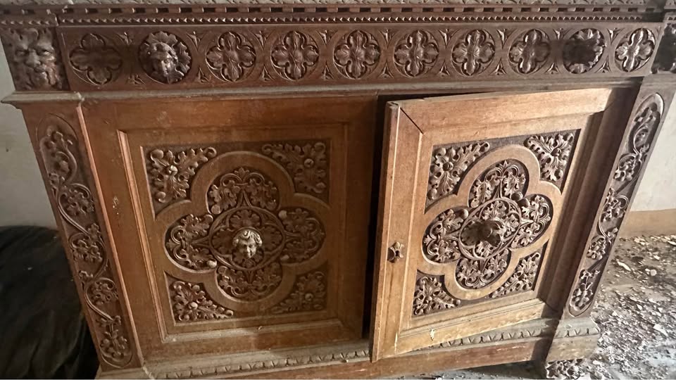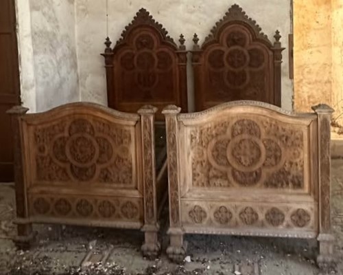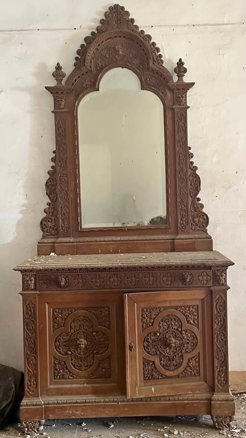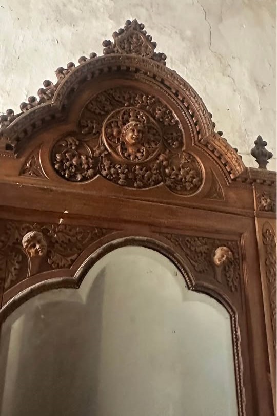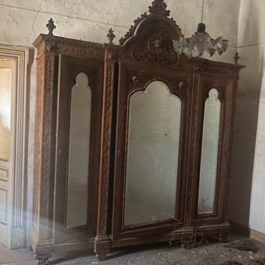 W skład kompletu z drewna wchodzi: 2 x łóżko, szafa z lustrami, szafka z lustrem.