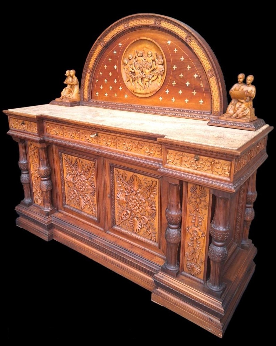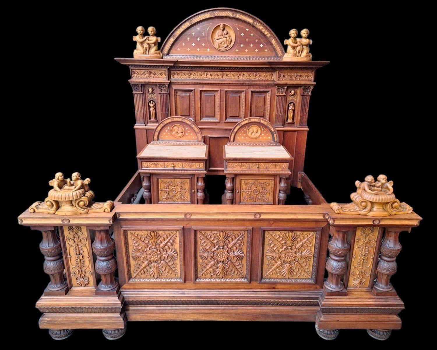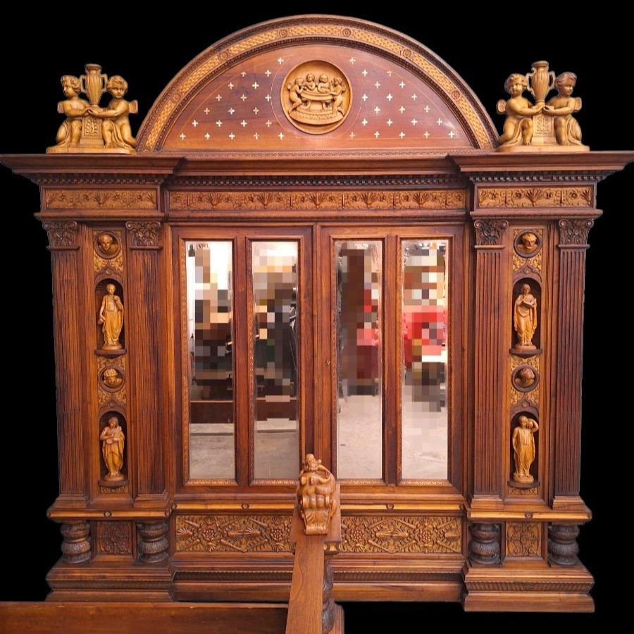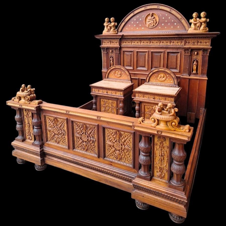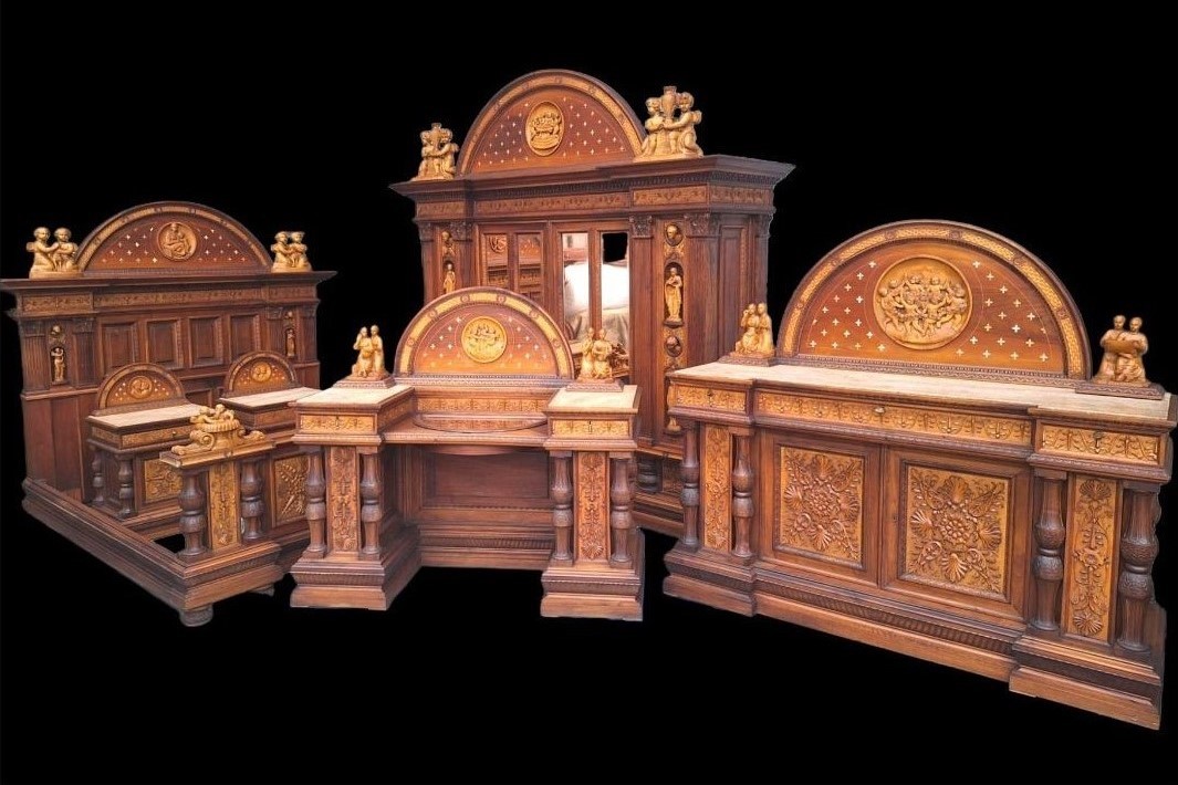 W skład kompletu z drewna orzechowego wchodzi: łoże, 2 x szafka nocna, szafa z lustrami, kredens, toaletka.