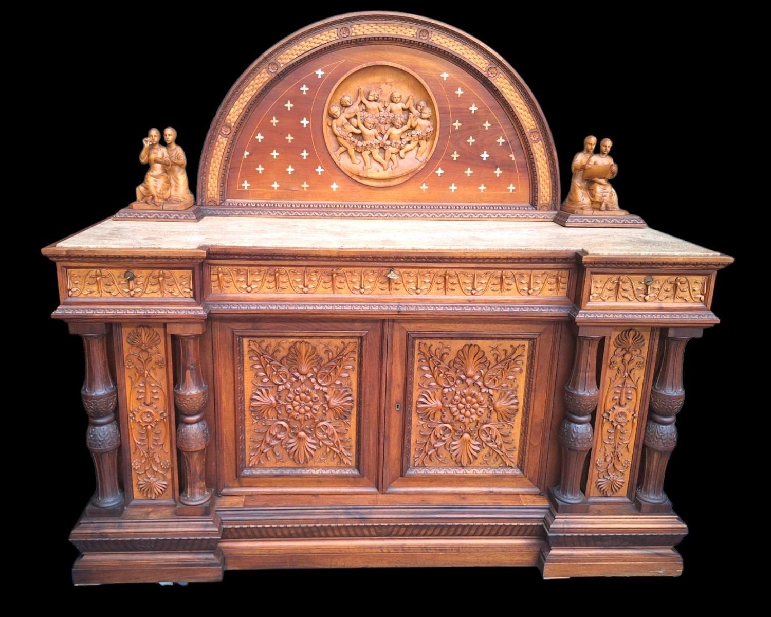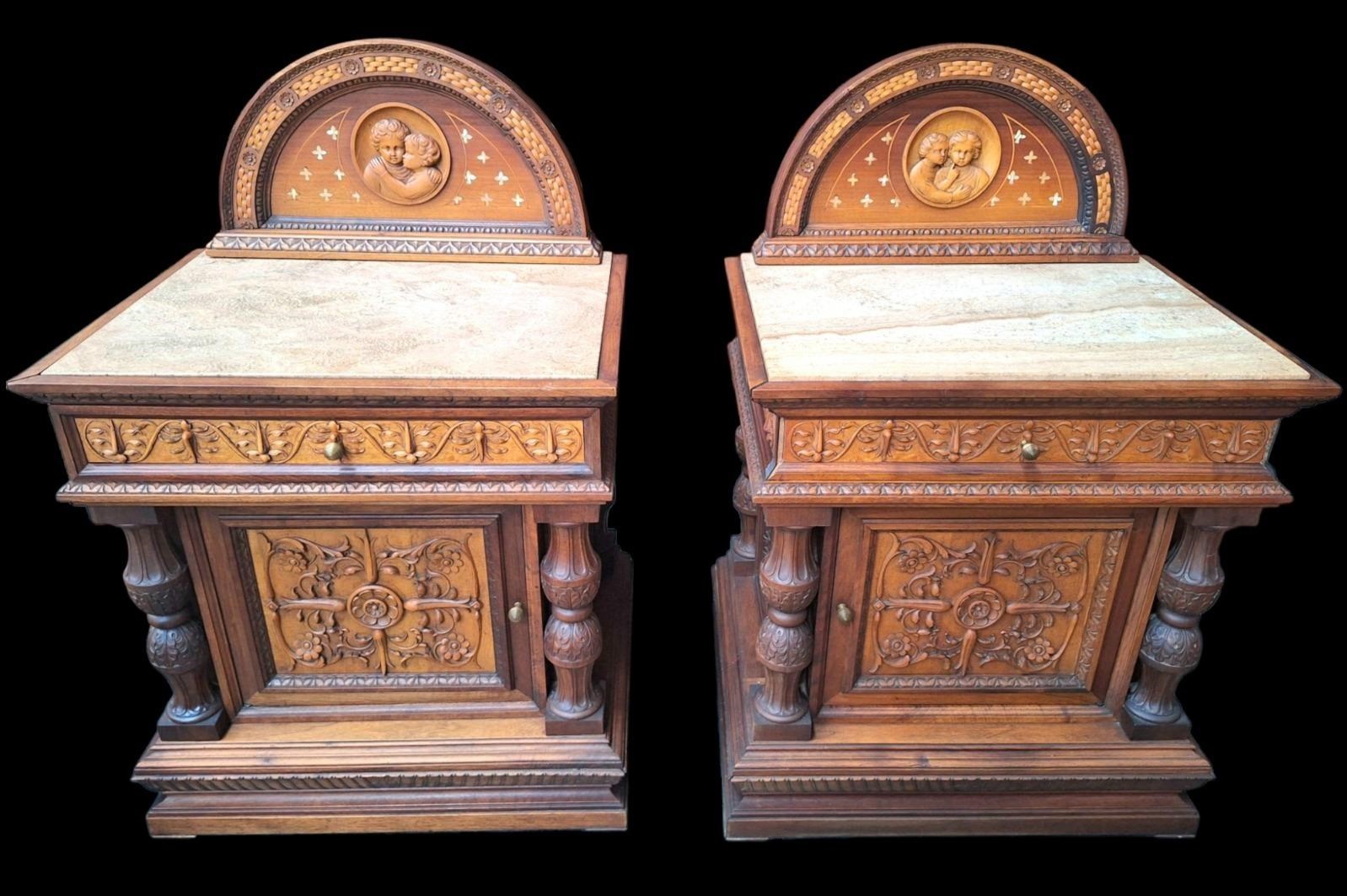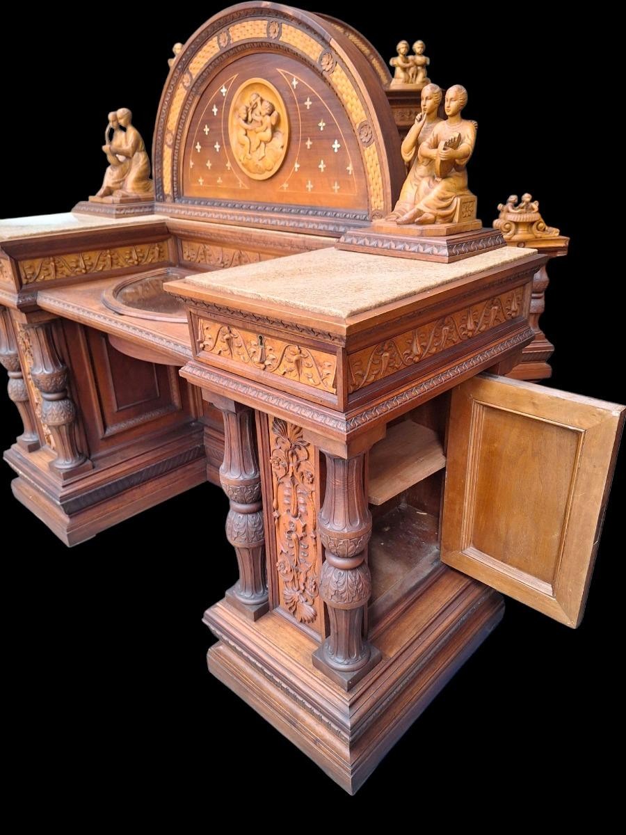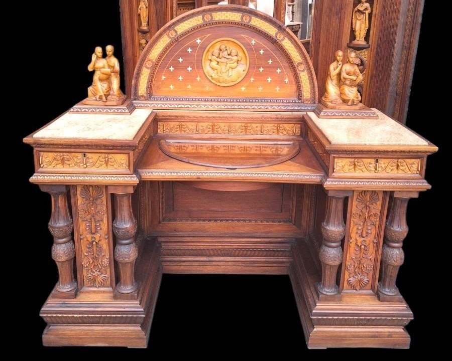 W skład kompletu z drewna orzechowego wchodzi: łoże, 2 x szafka nocna, szafa z lustrami, kredens, toaletka.