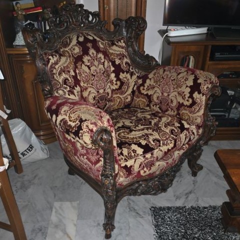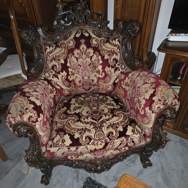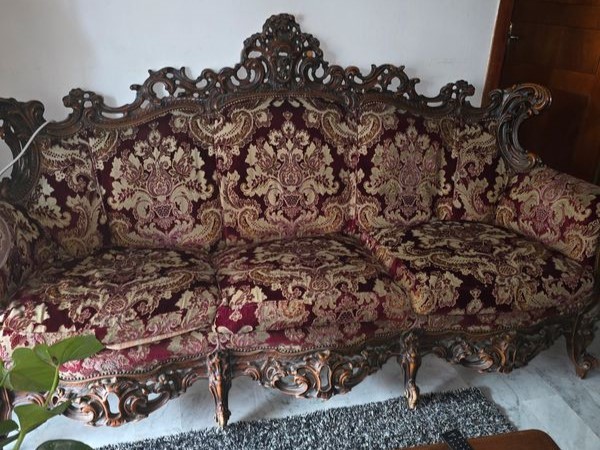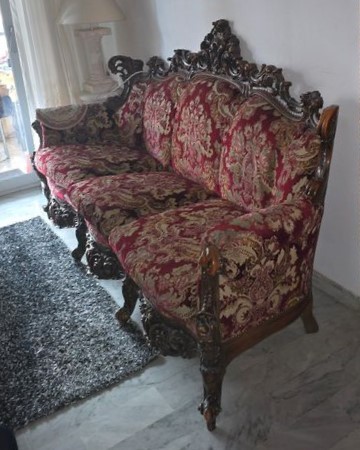 W skład kompletu z drewna wchodzi: sofa, 2 x fotel.