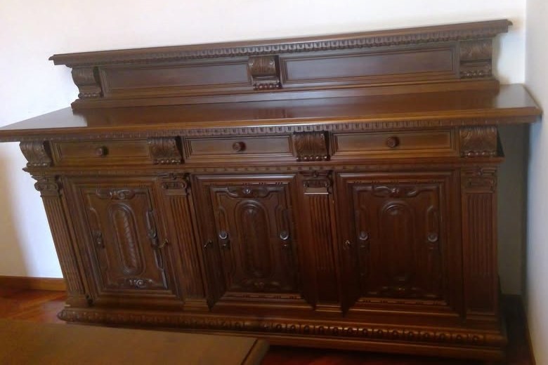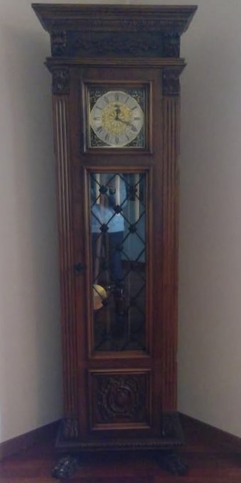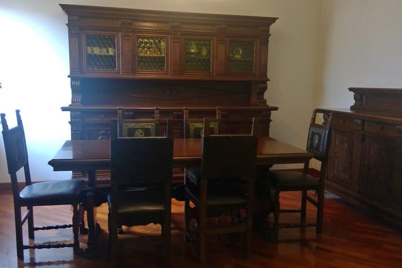 W skład kompletu wchodzi: kredens, bufet, stół, 6 x krzesło, zegar stojący.