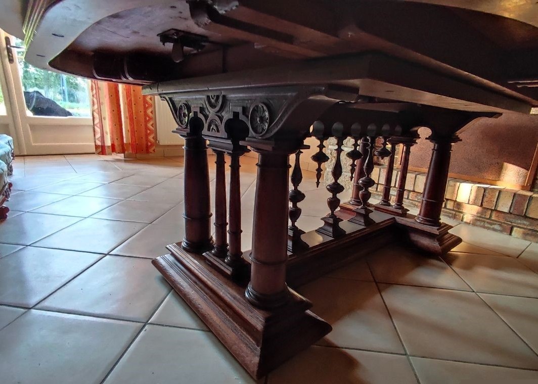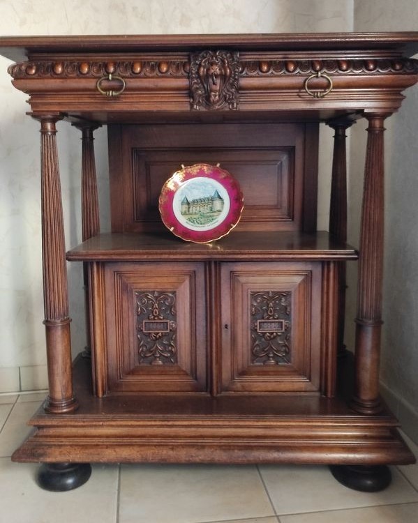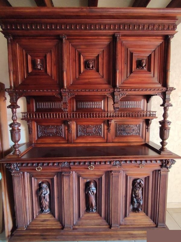 W skład kompletu z drewna orzechowego i dryftowego wchodzi: kredens, szafka, duży stół.