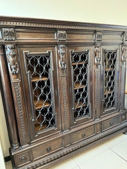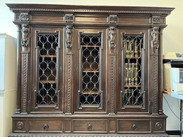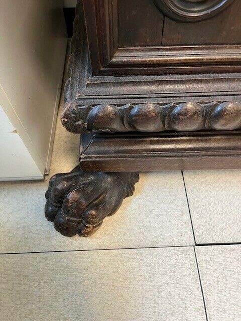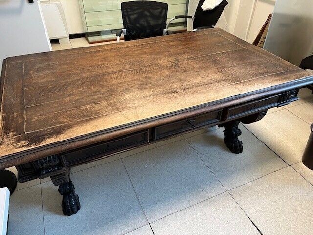 W skład kompletu wchodzą: 3-drzwiowa szafa z szufladami, biurko z trzema szufladami, 2 x siedzenie (do renowacji).