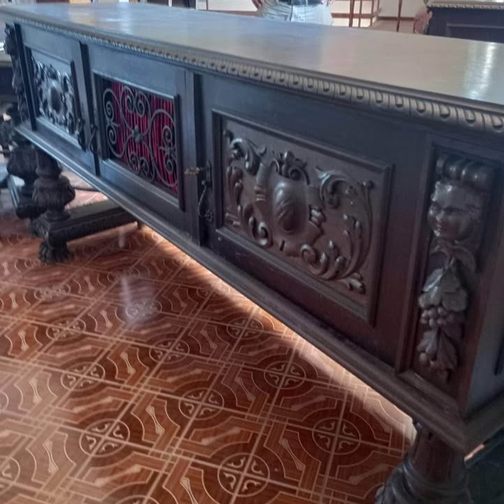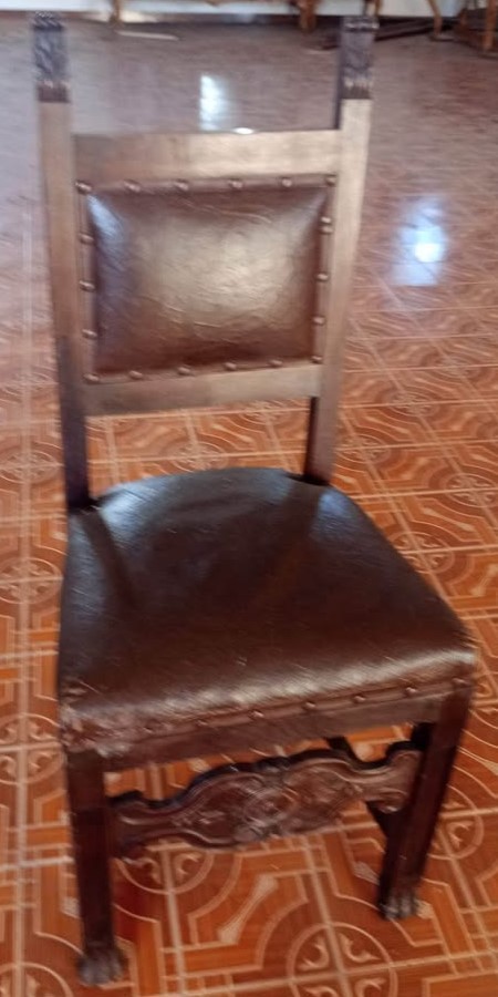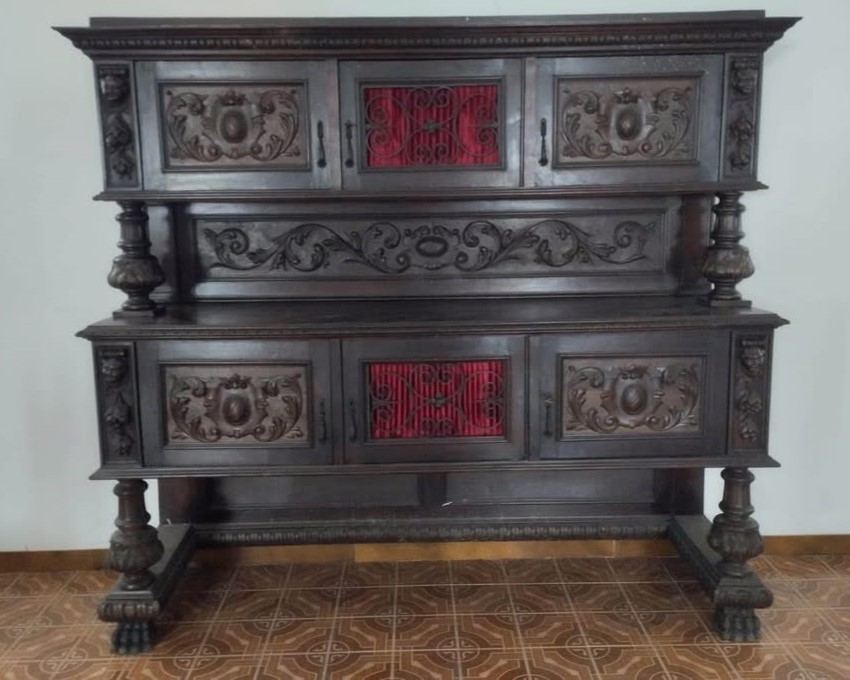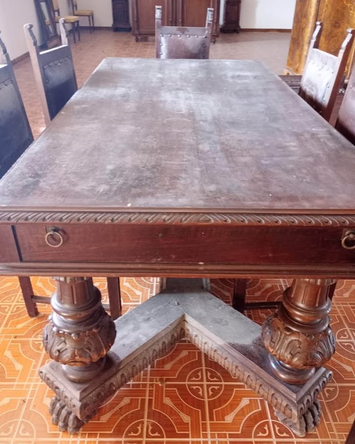 W skład kompletu z drewna orzechowego wchodzi: kredens, stół, 6 x krzesło.
