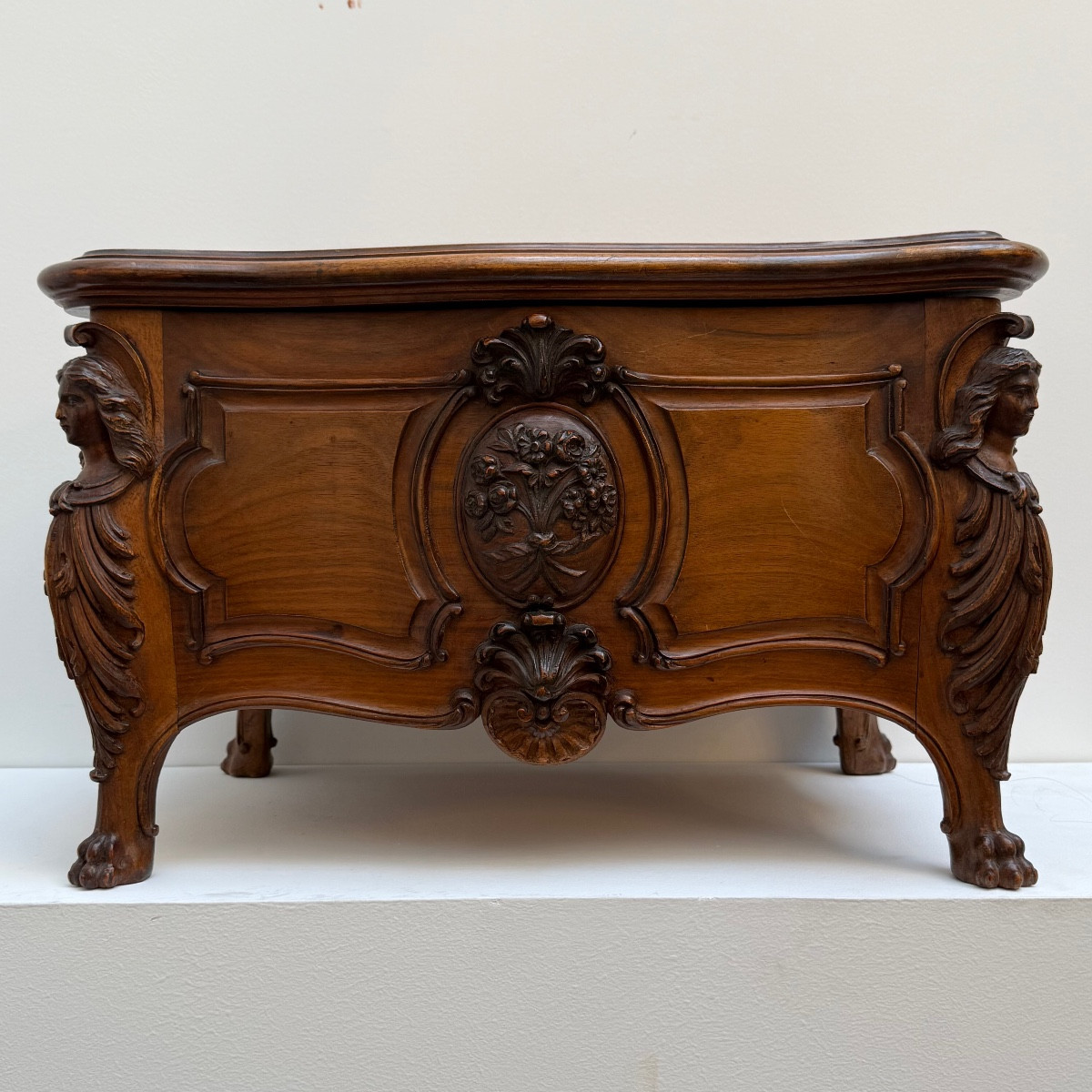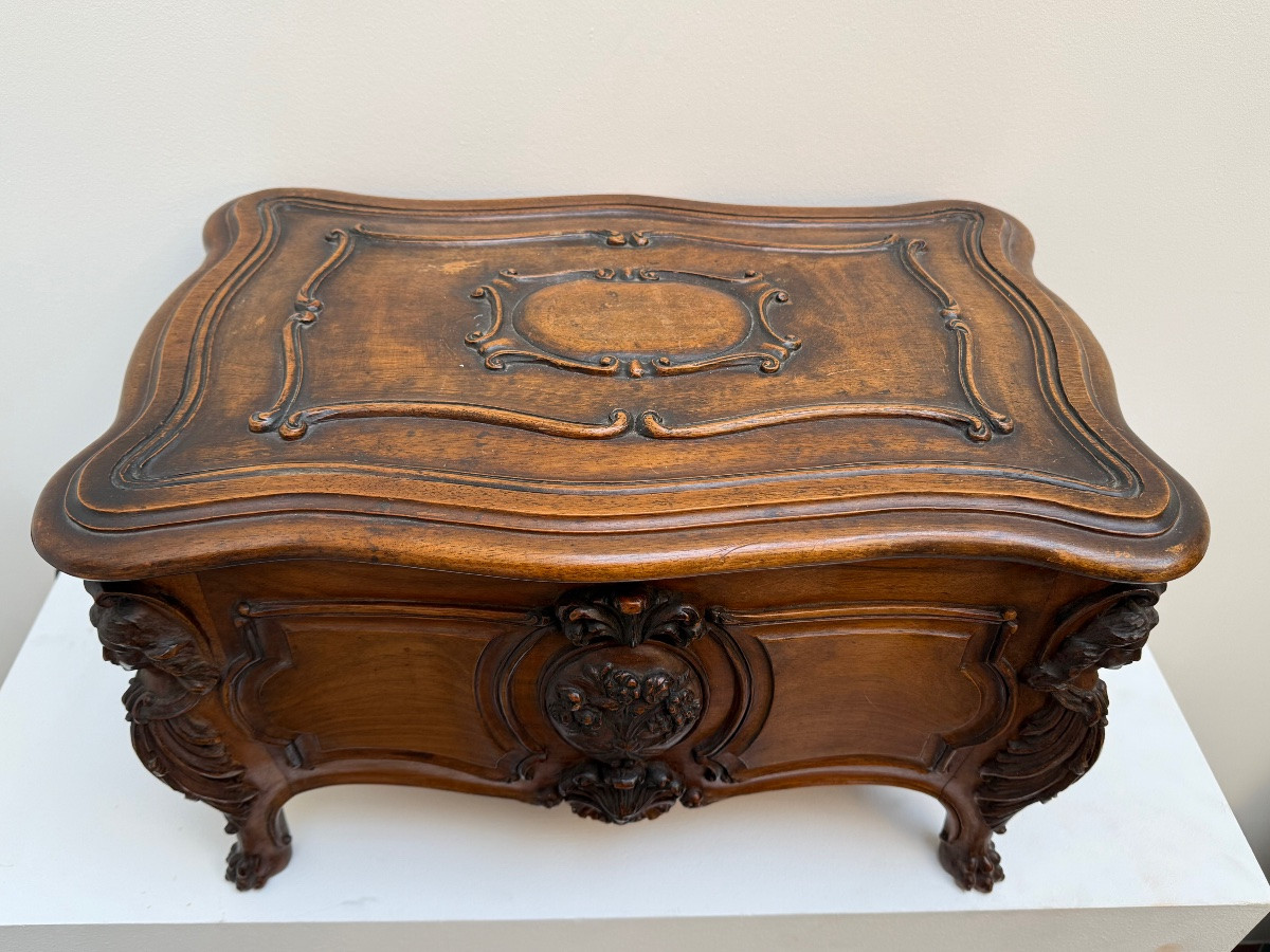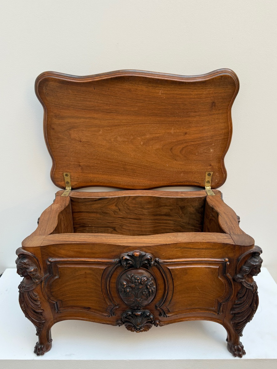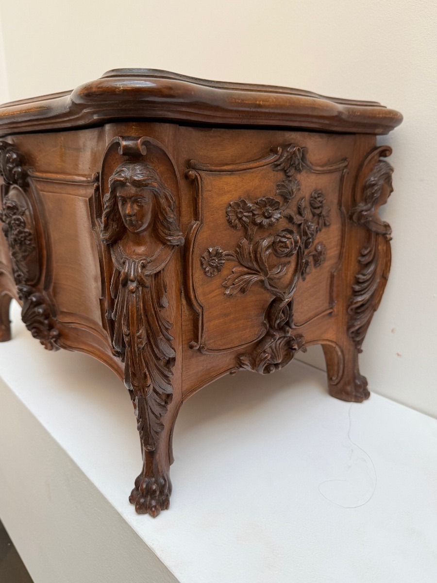Elegancka skrzynia zachwycająca zakrzywionymi kształtami oraz misternie rzeźbionymi detalami. Jej unikalny design łączy w sobie klasyczne piękno z nowoczesnym stylem, co sprawia, że doskonale wpisuje się w różnorodne wnętrza. Skrzynia nie tylko pełni funkcję praktyczną, oferując przestrzeń do przechowywania, ale także stanowi efektowny element dekoracyjny, który przyciąga wzrok i nadaje elegancji każdemu pomieszczeniu.