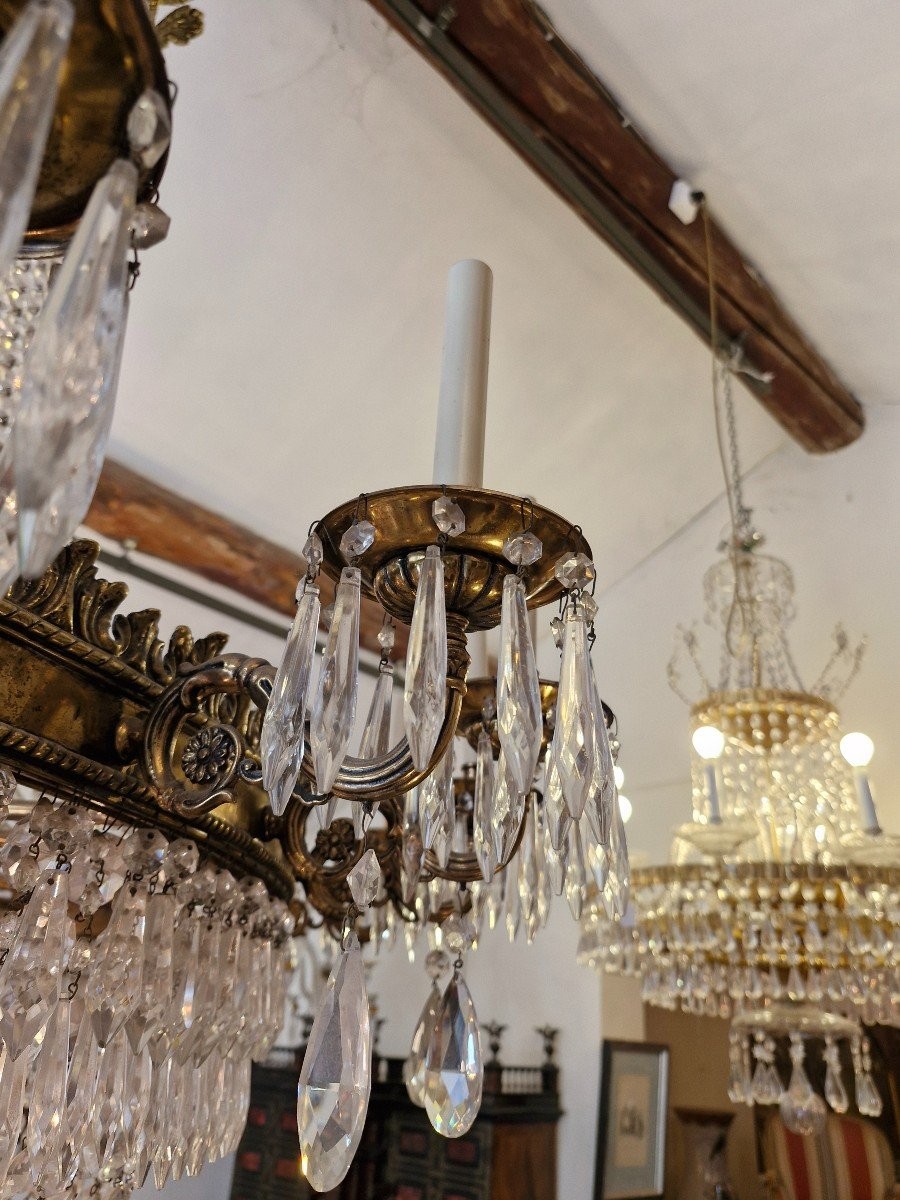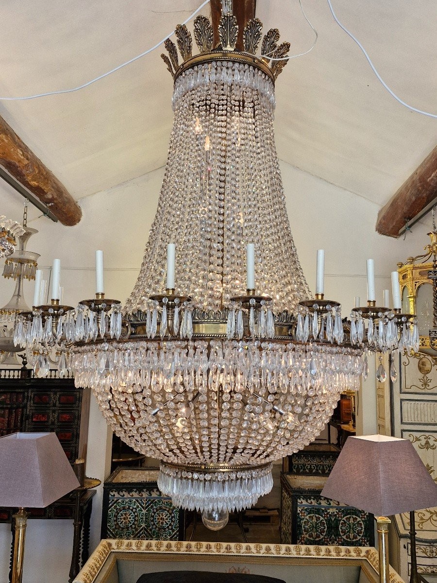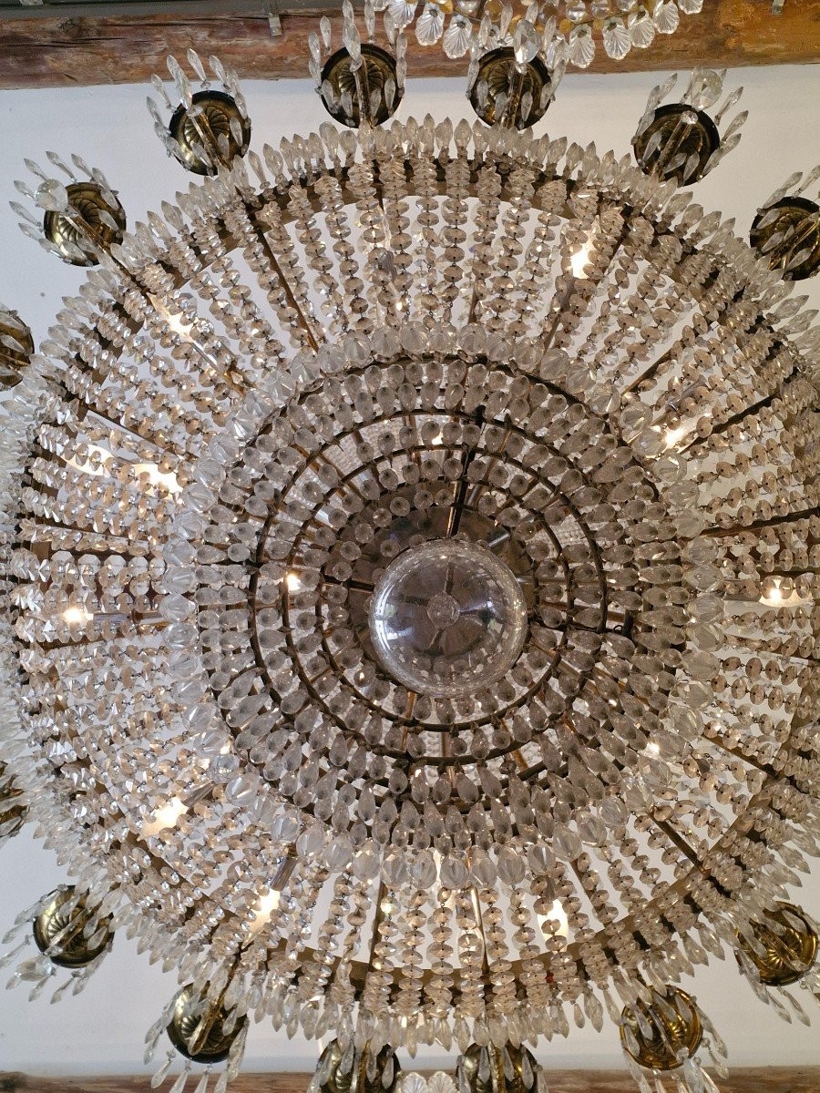 Żyrandol z brązu i kryształów w kształcie balonu na ogrzane powietrze. Na okrągłym pasku znajduje się 20 lamp.