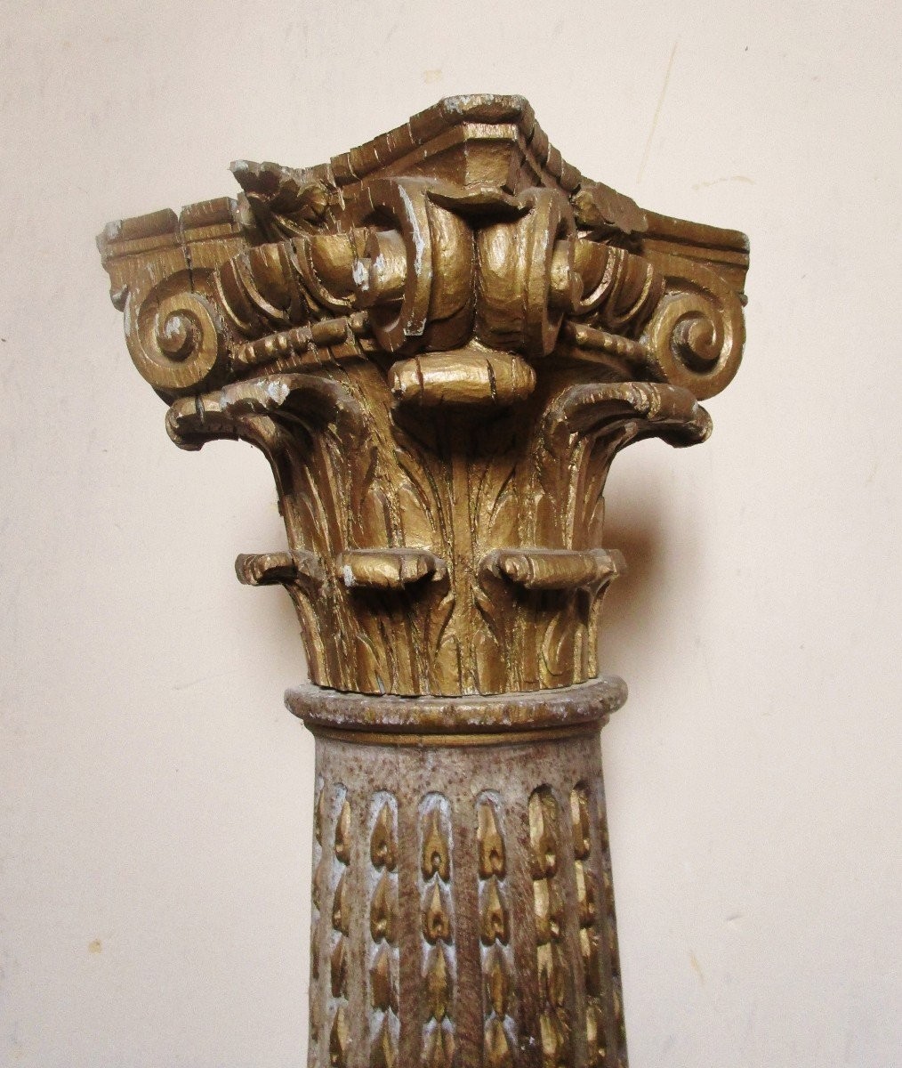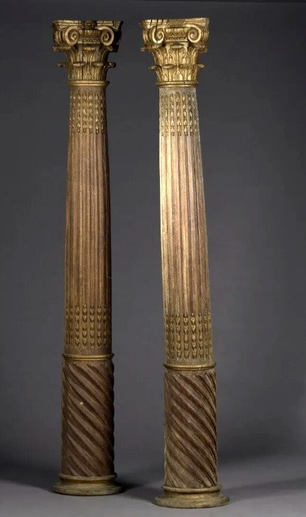 Para kolumn korynckich z drewna. Góra i dół zostały pozłocone.